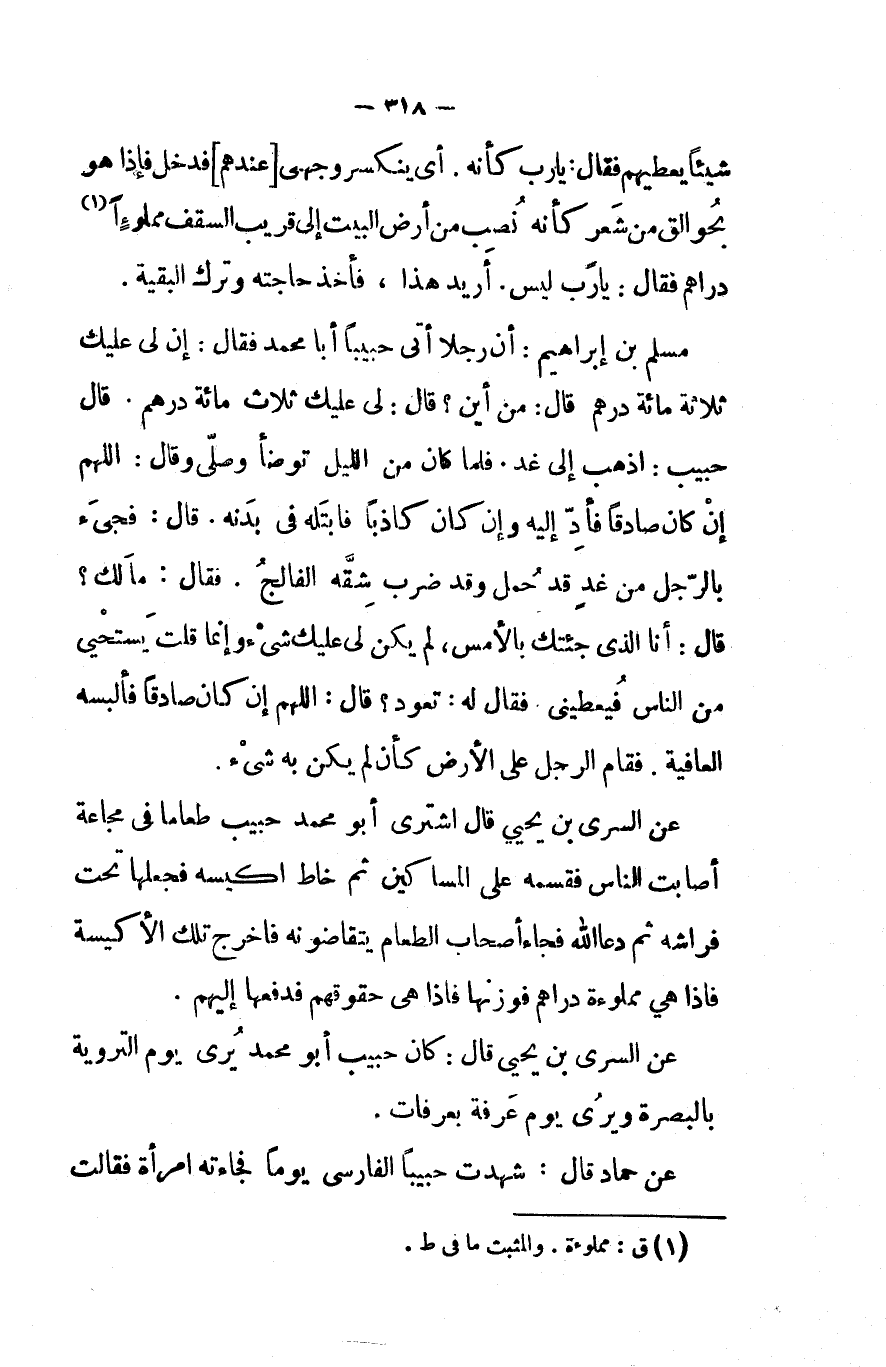 مسلم بن إبراهيم أن رجلا أتى حبيبا أبا محمد فقال إن لى عليك ثلاثة مائه درهم قال من أين قال لى عليك ثلاث مائة درهم قال حبيب اذهب إلى غد فلما كان من الليل توضأ وصلى وقال اللهم إن كان صادقا فأد إليه وإن كان كاذبا فابتله فى بدنه قال فجىء بالرجل من غد قد حمل وقد ضرب شقة الفالج فقال مالك قال أنا الذى جئتك فى بالأمس لم يكن لى عليك شىء وأنما قلت يستحي من الناس فيعطينى فقال له تعود قال اللهم إن كان صادقا فألبسه العافية فقام الرجل على الأرض كأن لم يكن به شىء