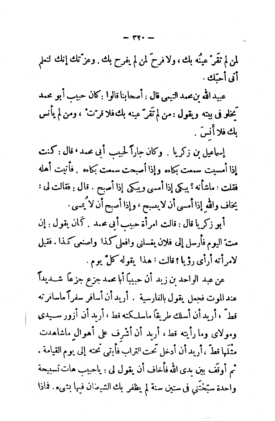 إسماعيل بن زكريا وكان جارا لحبيب أبي محمد قال كنت إذا أمسيت سمعت بكاءه وإذا أصبحت سمعت بكاءه فأتيت أهله فقلت ما شأنه يبكى إذا أمسى ويبكي إذا أصبح قال فقالت لى يخاف والله إذا أمسى أن لا يصبح وإذا أصبح أن لا يمسى