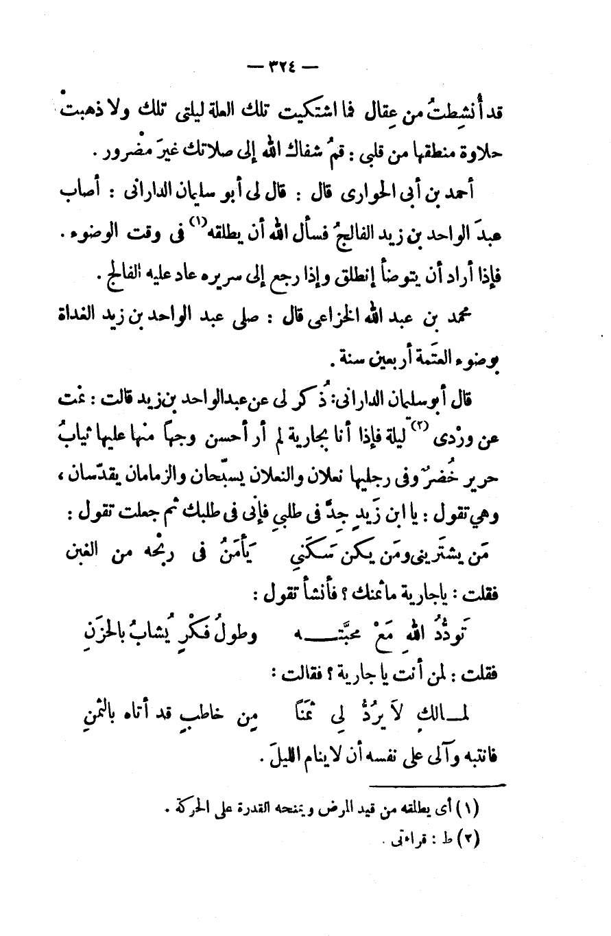 أحمد بن أبى الحوارى قال قال لى أبو سليمان الدارانى أصاب عبد الواحد بن زيد الفالج فسأل الله أن يطلقه فى وقت الوضوء فإذا أراد أن يتوضأ إنطلق وإذا رجع إلى سريره عاد عليه الفالج