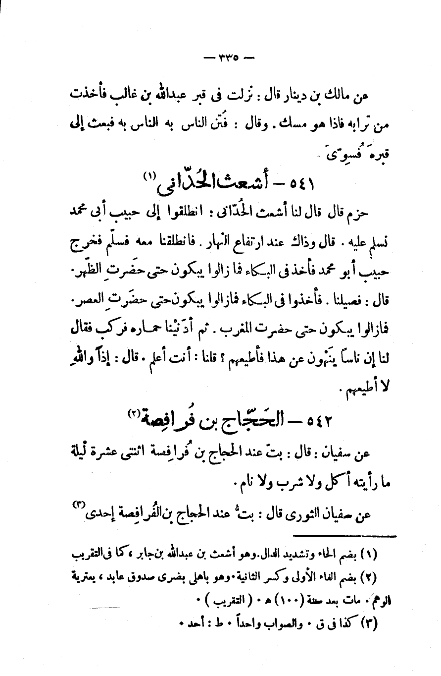 حزم قال قال لنا أشعث الحدانىانطلقوا إلى حبيب أبى محمد نسلم عليه قال وذاك عند ارتفاع النهار فانطلقنا معه فسلم فخرج حبيب أبو محمد فأخذ فى البكاء فما زالوا يبكون حتى حضرت الظهر قال فصيلنا فأخذوا فى البكاء فما زالوا يبكون حتى حضرت العصر فما زالوا يبكون حتى حضرت المغرب ثم أدنينا حماره فركب فقال لنا إن أناسا ينهون عن هذا فأطيعهم قلنا أنت أعلم قال إذا والله لا أطيعهم