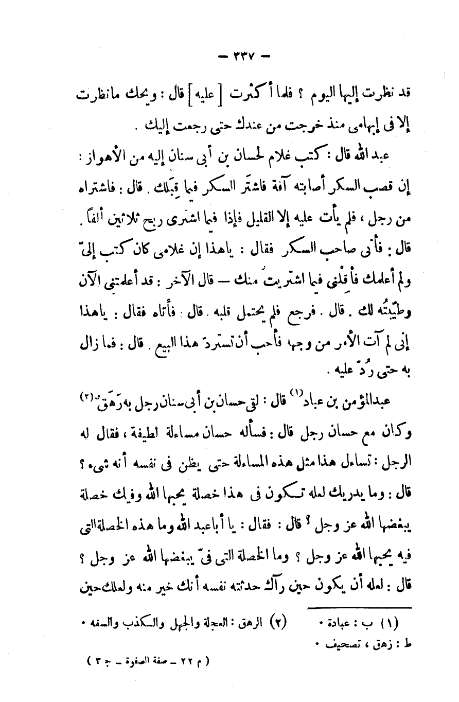 عبد الله قال كتب غلام لحسان بن أبى سنان إليه من الأهواز إن قصب السكر أصابته آفه فاشتر السكر فيمل قبلك قال فاشتراه من رجل فلم يأت عليه إلا القليل فإذا فيما اشترى ربح ثلاثين ألفا قال فأتى صاحب السكر فقال يا هذا إن غلامى كان كتب إلى ولم أعلمك فأقلنى فيما اشتريت منك قال الآخر قد أعلمتني الآن وطبيته لك قال فرجع فلم يحتمل قلبه قال فأتاه فقال يا هذا إنى لم آت الامر من وجهه فأحب أن تسترد هذا البيع قال فما زال به حتى رد عليه