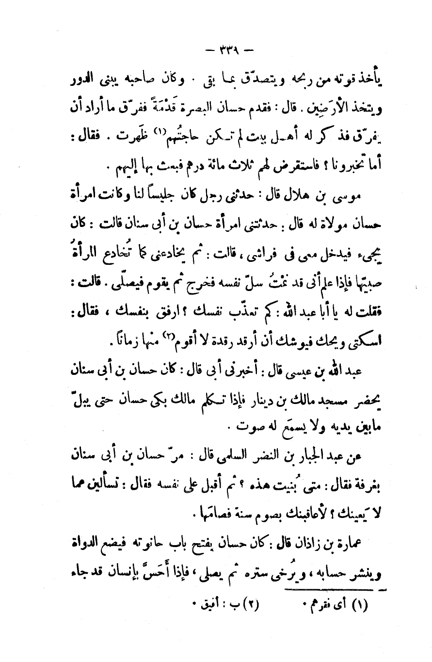 يأخد قوته من ربحه ويتصدق بما بقي وكان صاحبه يبنى الدور ويتخذ الأرضين قال فقدم حسان البصرة قدمه ففرق ما أراد أن يفرق فذكر له أهل بيت لم تكن حاجتهم ظهرت فقال أما تخبرونا فاستقرض لهم ثلاث مائة درهم فبعث بها إليهم