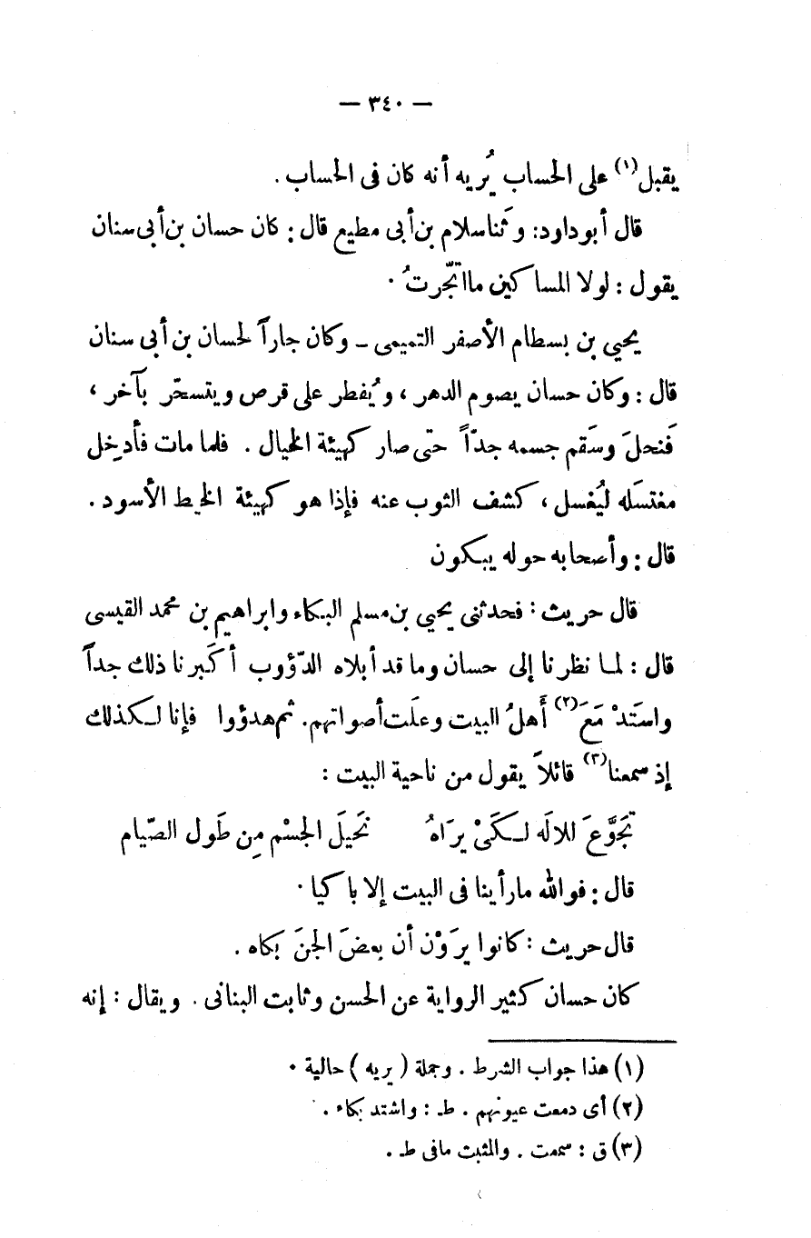 قال حريث فحدثنى يحيى بن مسلم البكاء وإبراهيم بن محمد القيسى قال لما نظرنا إلى حسان وما قد أبلاه الدؤوب أكبرنا ذلك جدا واستدمع أهل البيت وعلت أصواتهم ثم هدؤوا فإنا لكذلك إذ سمعنا قائلا يقول من ناحيه البيت