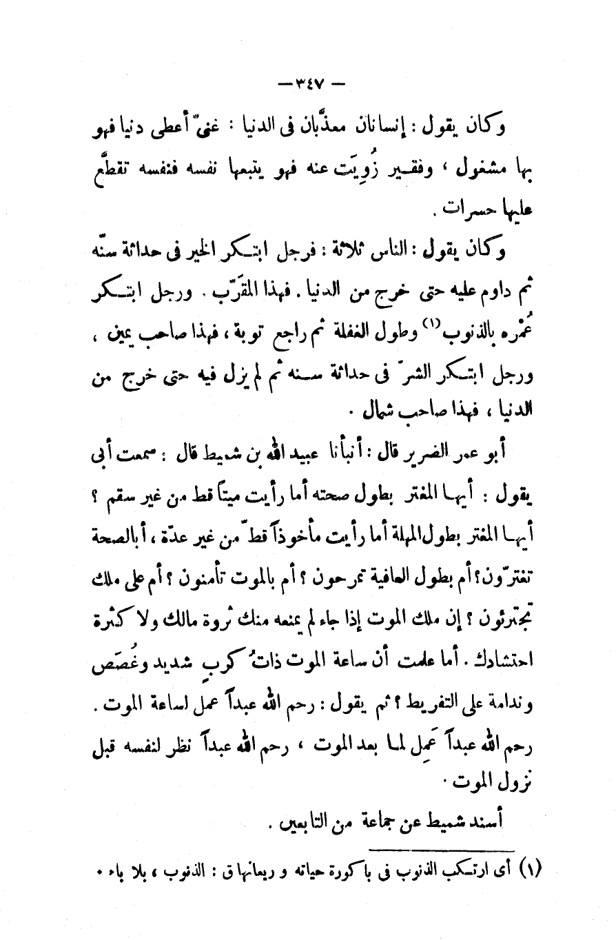 وكان يقول الناس ثلاثة فرجل ابتكر الخير فى حداثه سنه ثم داوم عليه حتى خرج من الدنيا فهذا المقرب ورجل ابتكر عمره بالذنوب وطول الغفله ثم راجع توبة فهذا صاحب يمين ورجل ابتكر الشر فى حداثه سنه ثم لم يزل فيه حتى خرج من الدنيا فهذا صاحب شمال