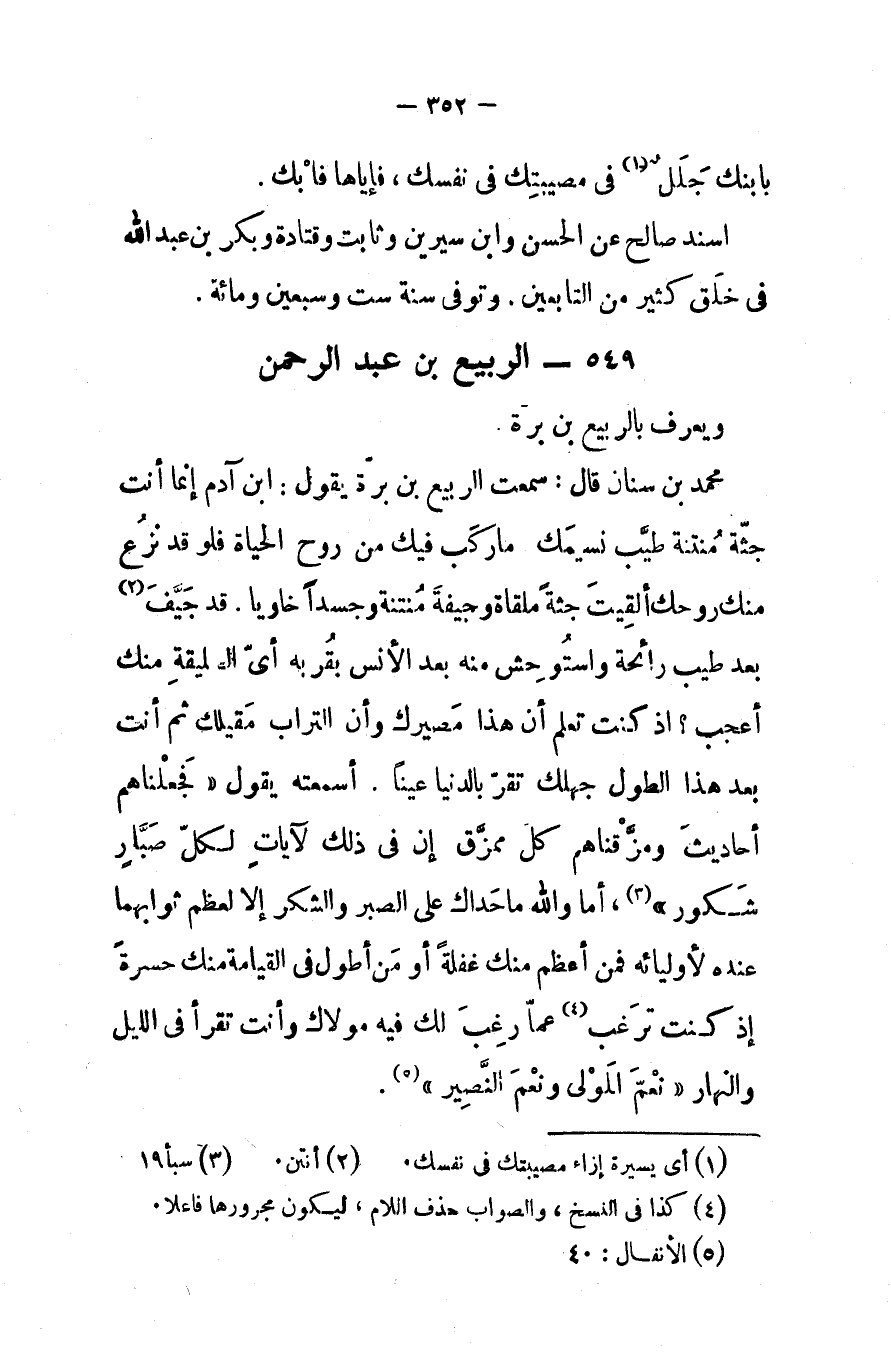 محمد بن سنان قال سمعت الربيع بن برة يقول ابن آدم إنما أنت جثة منتنة طيب نسيمك ماركب فيك من روح الحياة فلو قد نزع منك روحك ألقيت جثة ملقاة وجيفه منتنة وجسدا خاويا قد جيفبعد طيب رائحة واستوحش منه بعد الأنس بقربه أى الصليقة منك أعجب اذ كنت تعلم أن هذا مصيرك وأن التراب مقيلك ثم أنت بعد هذا الطول جهلك تقر بالدنيا عينا أسمعته يقول فجعلناهم أحاديث ومزقناهم كل ممزق إن فى ذلك لآيات لكل صبار شكور أما والله ماحداك على الصبر والشكر إلالعظم ثوابهما عنده لأوليائه فمن أعظم منك غفلة أو من أطول فى القيامة منك حسرة إذ كنت ترغب عما رغب لك فيه مولاك وأنت تقرأ فى الليل والنهار نعم المولى ونعم النصير