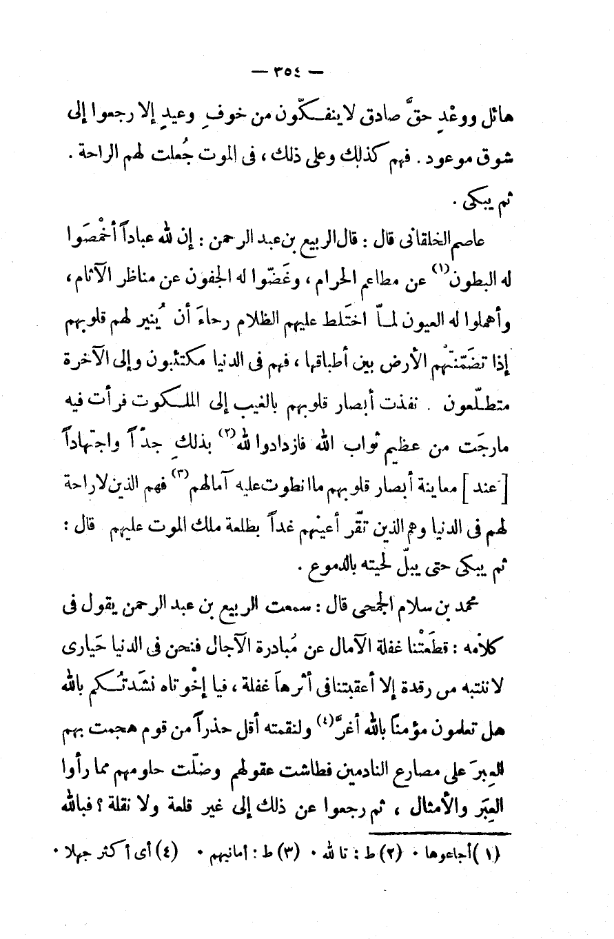 عاصم الخلقانى قال قال الربيع بن عبد الرحمن إن لله عبادا أخمصوا له البطون عن مطاعم الحرام وغضوا له الجفون عن مناظر الآثام وأهملوا له العيون لما اختلط عليهم الظلام رجاء أن ينير لهم قلوبهم إذا تضمنهم الارض بين أطباقها فهم الدنيا مكتئبون وإلى الآخرة متطلعون نفذت أبصار قلوبهم بالغيب إلى الملكوت فرأت فيه مارجت من عظيم ثواب الله فازدادوا لله بذلك جدا واجتهادا عند معاينه إبصار قلوبهم ما انطوت عليه آمالهم فهم الذين لاراحة لهم فى الدنيا وهم الذين تقر أعينهم غدا بطلعة ملك الموت عليهم قال ثم يبكى حتى يبل لحيته بالدموع