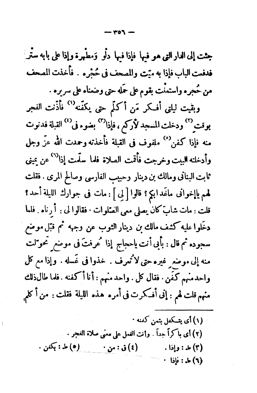 وبقيت ليلتى أفكر من أكلم حتى يكفنه فأذنت الفجر بوقت ودخلت المسجد لأركع فإذا بضوء فى القبله فدنوت منه فإذا كفن ملفوف فى القبلة فأخذته وحمدت الله عز و جل وأدخلته البيت وخرجت فأقمت الصلاة فلما سلمت إذا عن يمينى ثابت البنانى ومالك بن دينار وحبيب الفارسى وصالح المرى فقلت لهم يا أخوانى ما غدا بكم قالوا لى مات فى جوارك الليله أحد قلت مات شاب كان يصلى معى الصلوات فقالوا لى أرناه فلما دخلوا عليه كشف مالك بن دينار الثوب عن وجهه ثم قبل موضعسجوده ثم قال بأبي أنت ياحجاج إذا عرفت فى موضع تحولت منه إلى موضع غيره حتى لاتعرف خذوا فى غسله وإذا مع كل واحد منهم كفن فقال كل واحد منهم أنا أكفنه فلما طال ذلك منهم قلت لهم إنى أفكرت فى أمره هذه الليله فقلت من أكلم