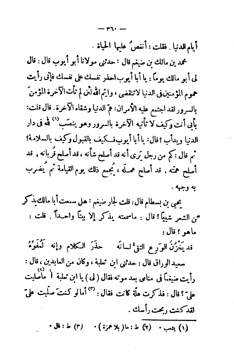 محمد بن مالك بن ضيغم قال حدثنى مولانا أبو أيوب قال قال لى أبو مالك يوما يا أبا أيوب احذر نفسك على نفسك فإنى رأيت هموم المؤمنين فى الدنيا لاتنقضى وأيم الله لئن لم تأت الآخرة المؤمن بالسرور لقد اجتمع عليه الأمران هم الدنيا وشقاء الآخرة قال قلت بأبى أنت وكيف لا تأتيه الآخرة بالسرور وهو ينصب لله فى دار الدنيا ويدأب قال يا أبا أيوب فكيف بالقبول وكيف بالسلامة ثم قال كم من رجل يرى أنه قد أصلح شأنه قد أصلح قربانه قد أصلح همته قد أصلح عمله يجمع ذلك يوم القيامه ثم يضرب به وجهه