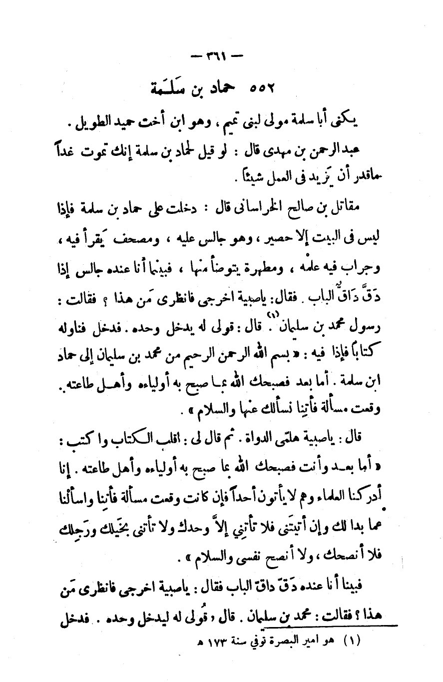 مقاتل بن صالح الخراساني قال دخلت على حماد بن سلمة فإذا ليس فى البيت إلا حصير وهو جالس عليه ومصحف يقرأ فيه وجراب فيه علمه ومطهرة يتوضأ منها فبينما أنا عنده جالس إذا دق داق الباب فقال ياصبية اخرجي فانظرى من هذا فقالت رسول محمد بن سليمان قال قولى له يدخل وحده فدخل فناوله كتابا فإذا فيه بسم الله الرحمن الرحيم من محمد بن سليمان إلى حماد ابن سلمة أما بعد فصبحك الله بما صبح به أولياءه وأهل طاعته وقعت مسأله فأتنا نسألك عنها والسلام
