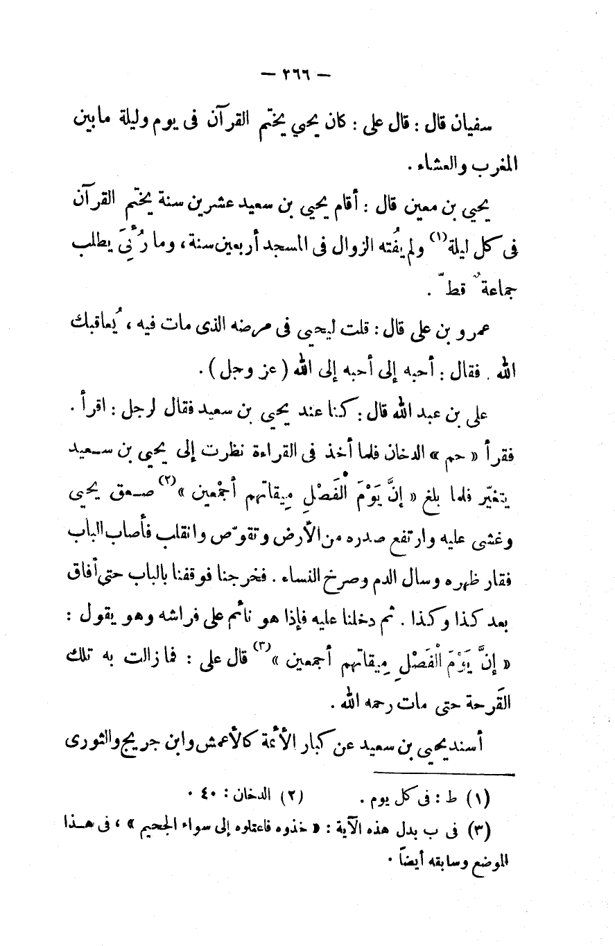 يحيى بن معين قال أقام يحيى بن سعيد عشرين سنة يختم القرآن فى كل ليله ولم يفته الزوال فى المسجد أربعين سنة وما رئى يطلب جماعة قط