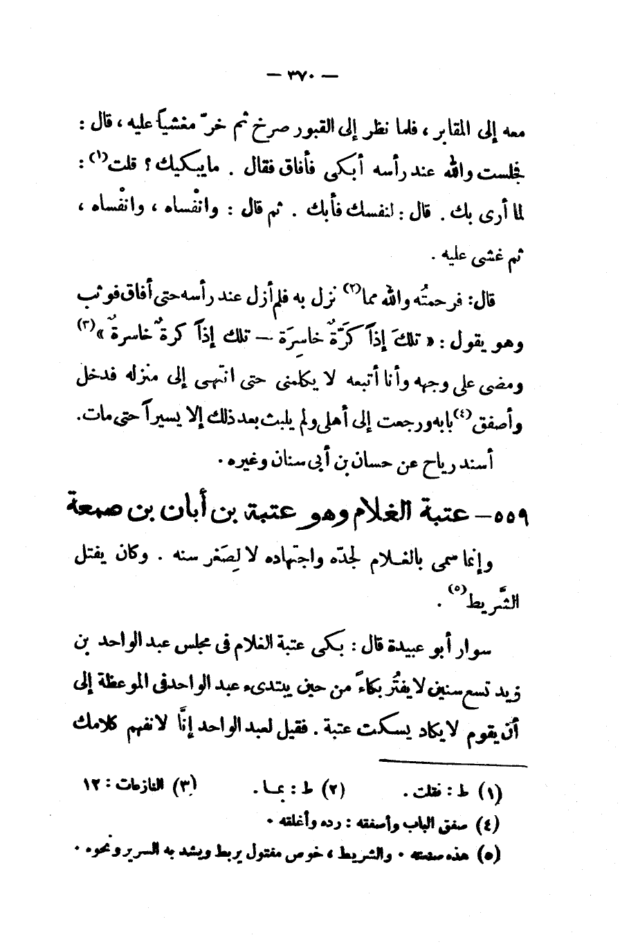 سوار أبو عبيده قال بكى عتبه الغلام فى مجلس عبد الواحد بن زيد تسع سنين لا يفتر بكاء من حين يبتدىء عبد الواحد فى الموعظه إلى أن يقوم لايكاد يسكت عتبة فقيل لعبد الواحد إنا لا نفهم كلامك
