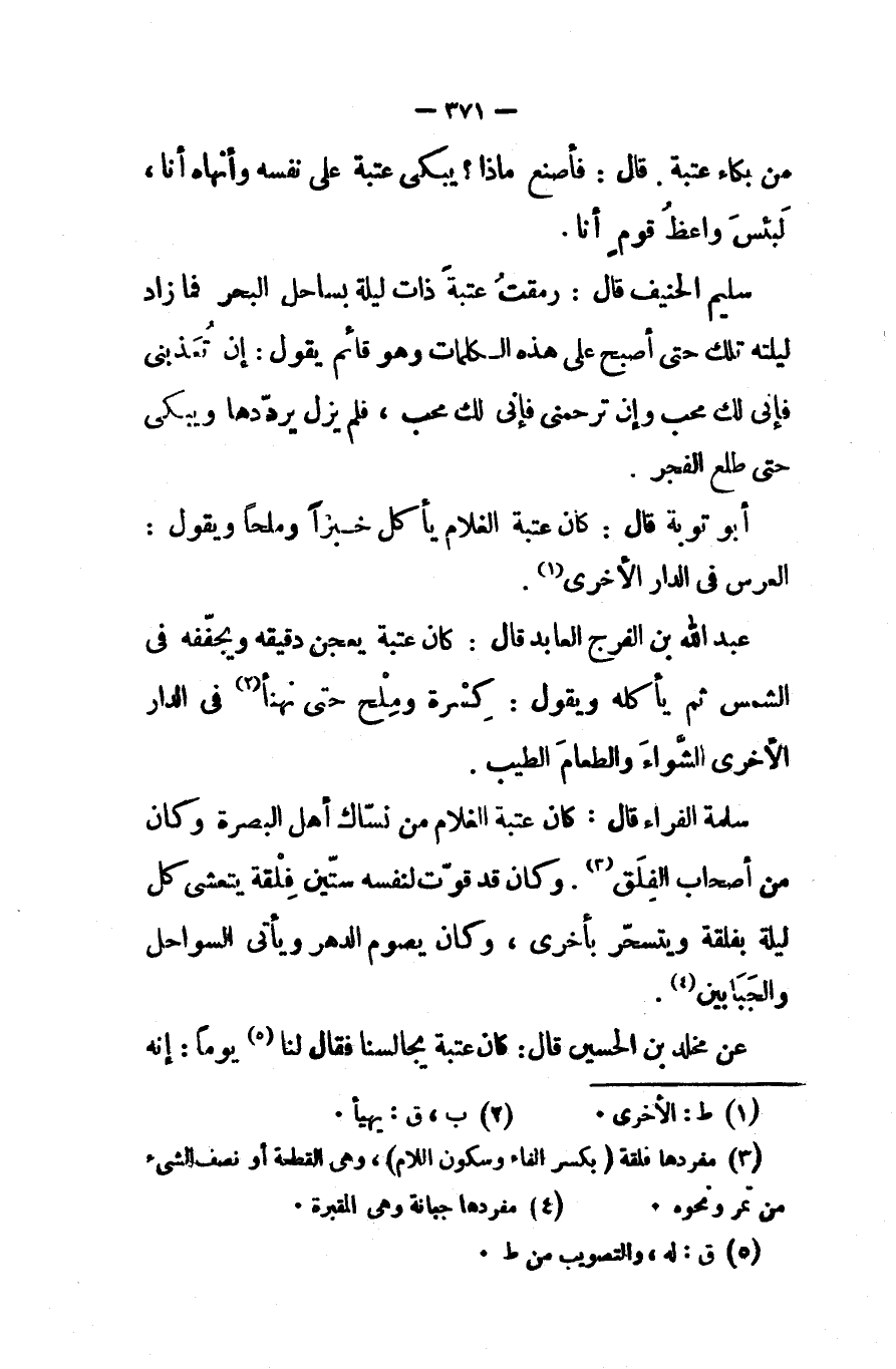 عبد الله بن الفرج العابد قال كان عتبه يعجن دقيقه ويجففه فى الشمس ثم يأكله ويقول كسرة وملح حتى نهنأ فى الدار الأخرى الشواء والطعام الطيب