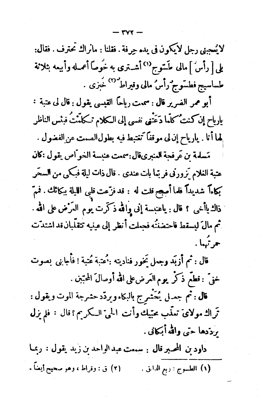 لا يعجبنى رجل لا يكون فى يده حرفه فقلنا ما نراك تحترف فقال بلى رأس مالى طسوج أشترى به خوصا أعمله وأبيعه بثلاثة طساسيج فطسوج رأس مالى وقيراط خبزى