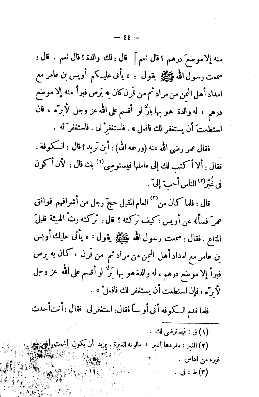 يأتي عليكم أويس بن عامر مع امداد أهل اليمن من مراد ثم من قرن كان به برص فبرأ منه إلا موضع درهم له والدة هو بها بار لو أقسم على الله عز و جل لأبره فان استطعت أن يستغفر لك فافعل فاستفعر لي فاستغفر له