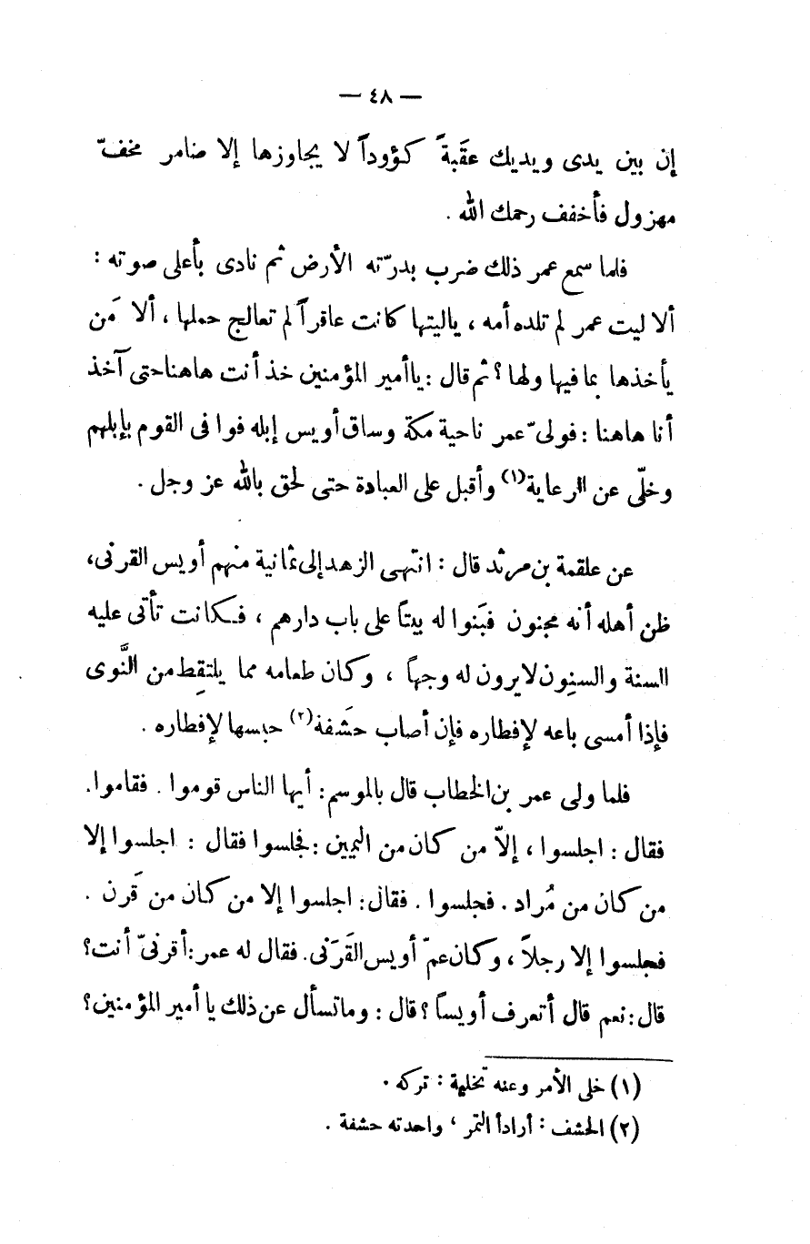 فلما سمع عمر ذلك ضرب بدرته الأرض ثم نادى بأعلى صوته ألا ليت عمر لم تلده أمه ياليتها كانت عاقرا لم تعالج حملها ألا من يأخذها بما فيها ولها ثم قال يا أمير المؤمنين خذ أنت هاهنا حتى آخذ أنا هاهنا فولى عمر ناحية مكة وساق أويس إبله فوافى القوم بإبلهم وخلى عن الرعاية وأقبل على العبادة حتى لحق بالله عز و جل