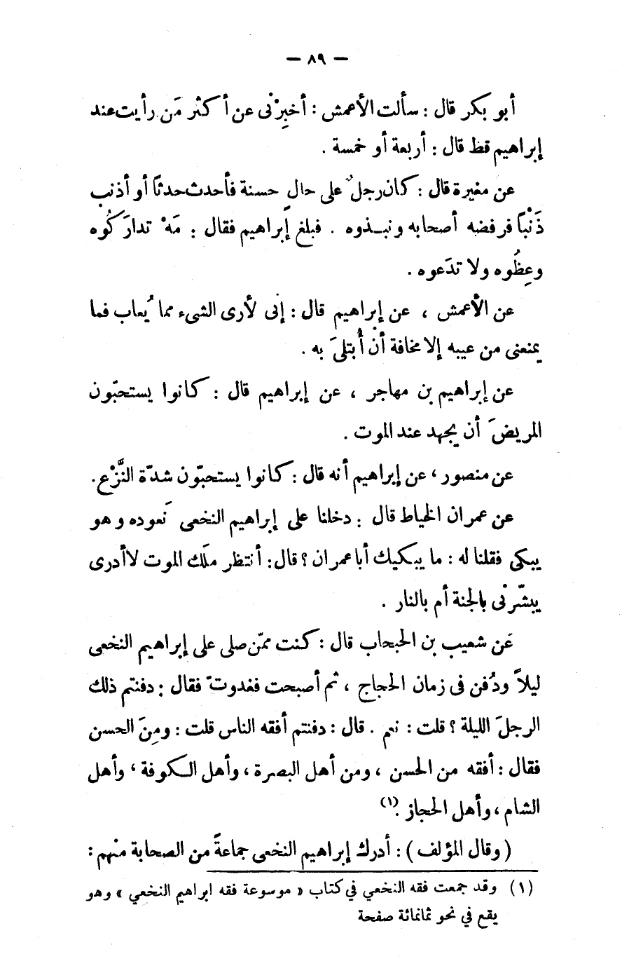عن عمران الخياط قال دخلنا على إبراهيم النخعى نعوده وهو يبكى فقلنا له ما يبكيك أبا عمران قال أنتظر ملك الموت لا أدري يبشرني بالجنة أم بالنار