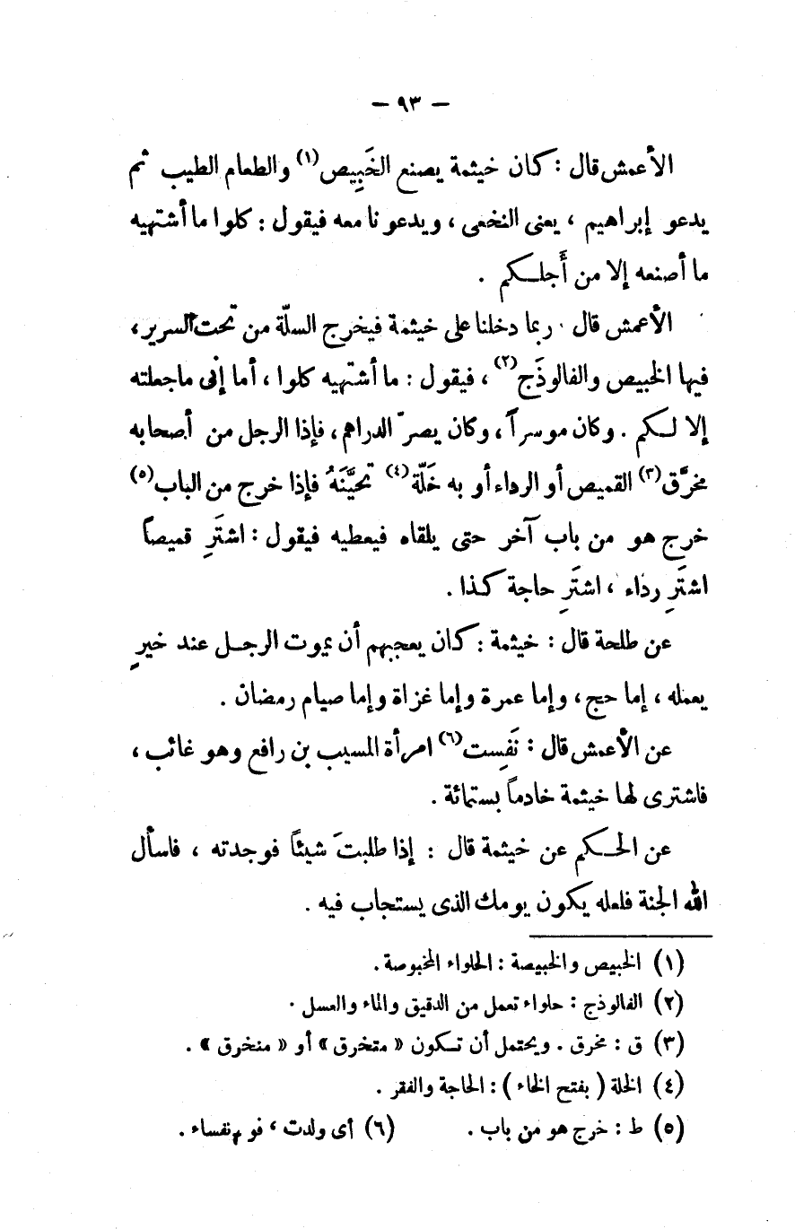 الأعمش قال كان خيثمة يصنع الخبيص والطعام الطيب ثم يدعو إبراهيم يعني النخعي ويدعونا معه فيقول كلوا ما أشتهيه ماأصنعه إلا من أجلكم