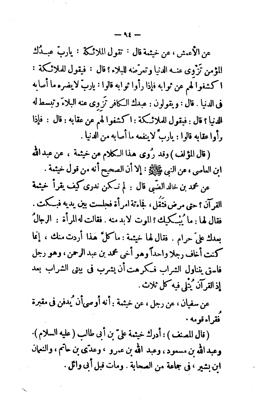 قال المؤلف وقد روى هذا الكلام عن خيثمة عن عبدالله ابن العاصي عن النبي صلى الله عليه و سلم إلا أن الصحيح أنه من قول خيثمة