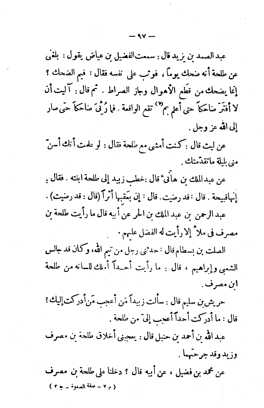 عبد الصمد بن يزيد قال سمعت الفضيل بن عياض يقول بلغني عن طلحة أنه ضحك يوما فوثب على نفسه فقال فيم الضحك إنما يضحك من قطع الأهوال وجاز الصراط ثم قال آليت أن لا أفتر ضاحكا حتى أعلم بم تقع الواقعة فما رئي ضاحكا حتى صار إلى الله عز و جل
