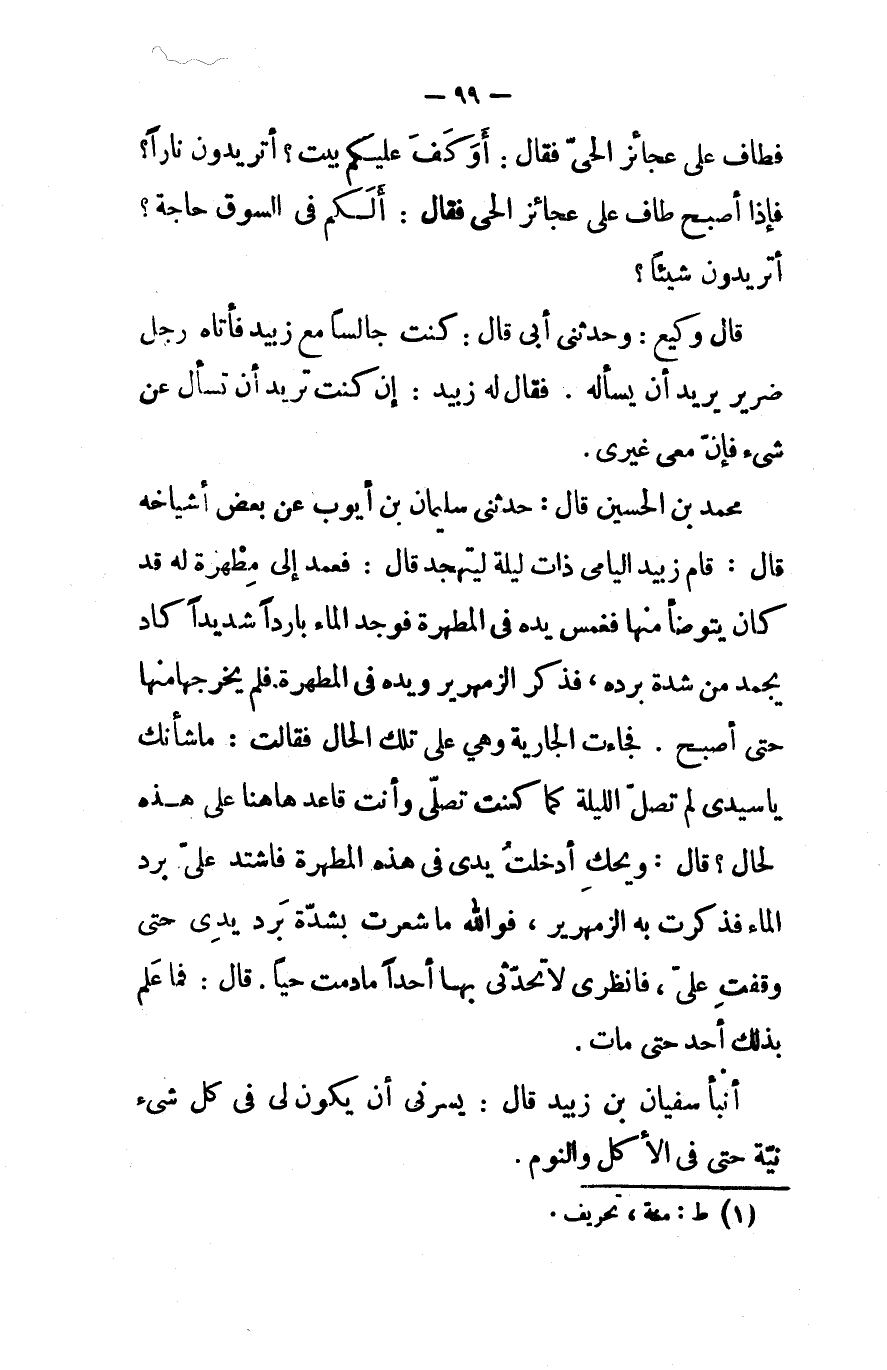 محمد بن الحسين قال حدثني سليمان بن أيوب عن بعض أشياخه قال قام زبيد اليامي ذات ليلة ليتهجد قال فعمد إلى مطهرة له قد كان يتوضأ منها فغمس يده في المطهرة فوجد الماء باردا شديدا كاد يجمد من شدة برده فذكر الزمهرير ويده في المطهرة فلم يخرجها منها حتى أصبح فجاءت الجارية وهي على تلك الحال فقالت ما شأنك يا سيدي لم تصل الليلة كما كنت تصلي وأنت قاعد هاهنا على هذه الحال قال ويحك أدخلت يدي في هذه المطهرة فاشتد على برد الماء فذكرت به الزمهرير فوالله ما شعرت بشدة برد يدي حتى وقفت علي فانظري لاتحدثي بها أحدا ما دمت حيا قال فما علم بذلك أحد حتى مات
