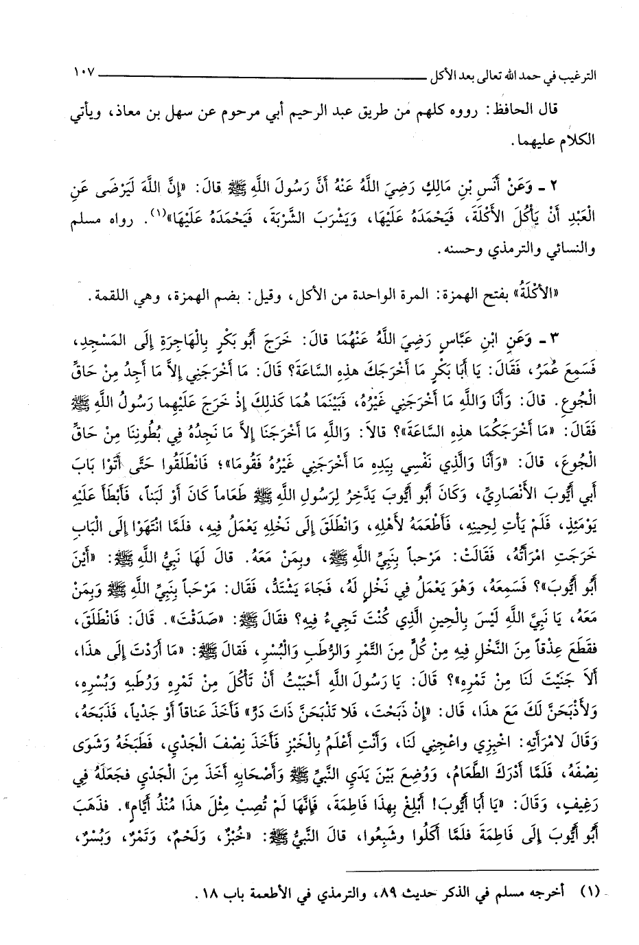 3271 - وَعَن أنس بن مَالك رَضِي الله عَنهُ أَن رَسُول الله صلى الله عَلَيْهِ وَسلم قَالَ إِن الله ليرضى عَن العَبْد أَن يَأْكُل الْأكلَة فيحمده عَلَيْهَا وَيشْرب الشربة فيحمده عَلَيْهَا