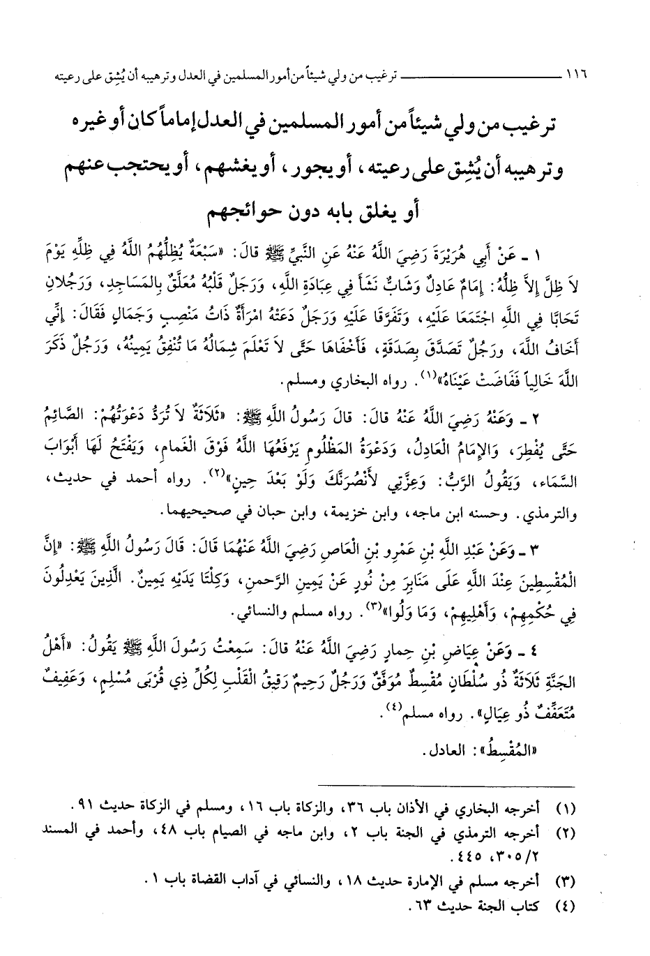 ترغيب من ولي شَيْئا من أُمُور الْمُسلمين فِي الْعدْل إِمَامًا كَانَ أَو غَيره وترهيبه أَن يشق على رَعيته أَو يجور أَو يغشهم أَو يحتجب عَنْهُم أَو يغلق بَابه دون حوائجهم