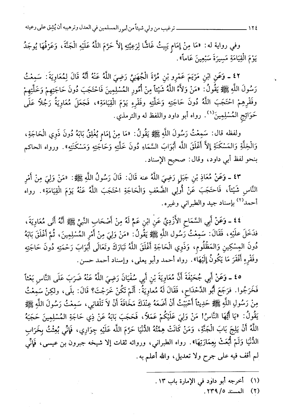 فَرجع أَبُو الدحداح فَقَالَ لَهُ مُعَاوِيَة ألم تكن خرجت قَالَ بلَى وَلَكِن سَمِعت من رَسُول الله صلى الله عَلَيْهِ وَسلم حَدِيثا أَحْبَبْت أَن أَضَعهُ عنْدك مَخَافَة أَن لَا تَلقانِي سَمِعت رَسُول الله صلى الله عَلَيْهِ وَسلم يَقُول يَا أَيهَا النَّاس من ولي عَلَيْكُم عملا فحجب بَابه عَن ذِي حَاجَة الْمُسلمين حجبه الله أَن يلج بَاب الْجنَّة وَمن كَانَت همته الدُّنْيَا حرم الله عَلَيْهِ جواري فَإِنِّي بعثت بخراب الدُّنْيَا وَلم أبْعث بعمارتها