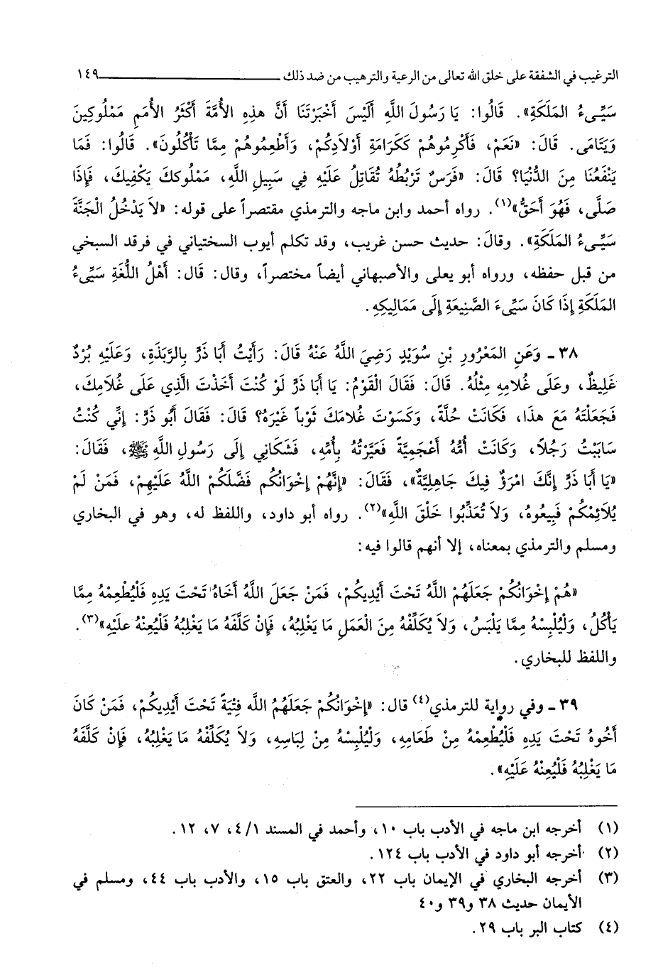 رَوَاهُ أَبُو دَاوُد وَاللَّفْظ لَهُ وَهُوَ فِي البُخَارِيّ وَمُسلم وَالتِّرْمِذِيّ بِمَعْنَاهُ إِلَّا أَنهم قَالُوا فِيهِ هم إخْوَانكُمْ جعلهم الله تَحت أَيْدِيكُم فَمن جعل الله أَخَاهُ تَحت يَده فليطعمه مِمَّا يَأْكُل وليلبسه مِمَّا يلبس وَلَا يكلفه من الْعَمَل مَا يغلبه فَإِن كلفه مَا يغلبه فليعنه عَلَيْهِ