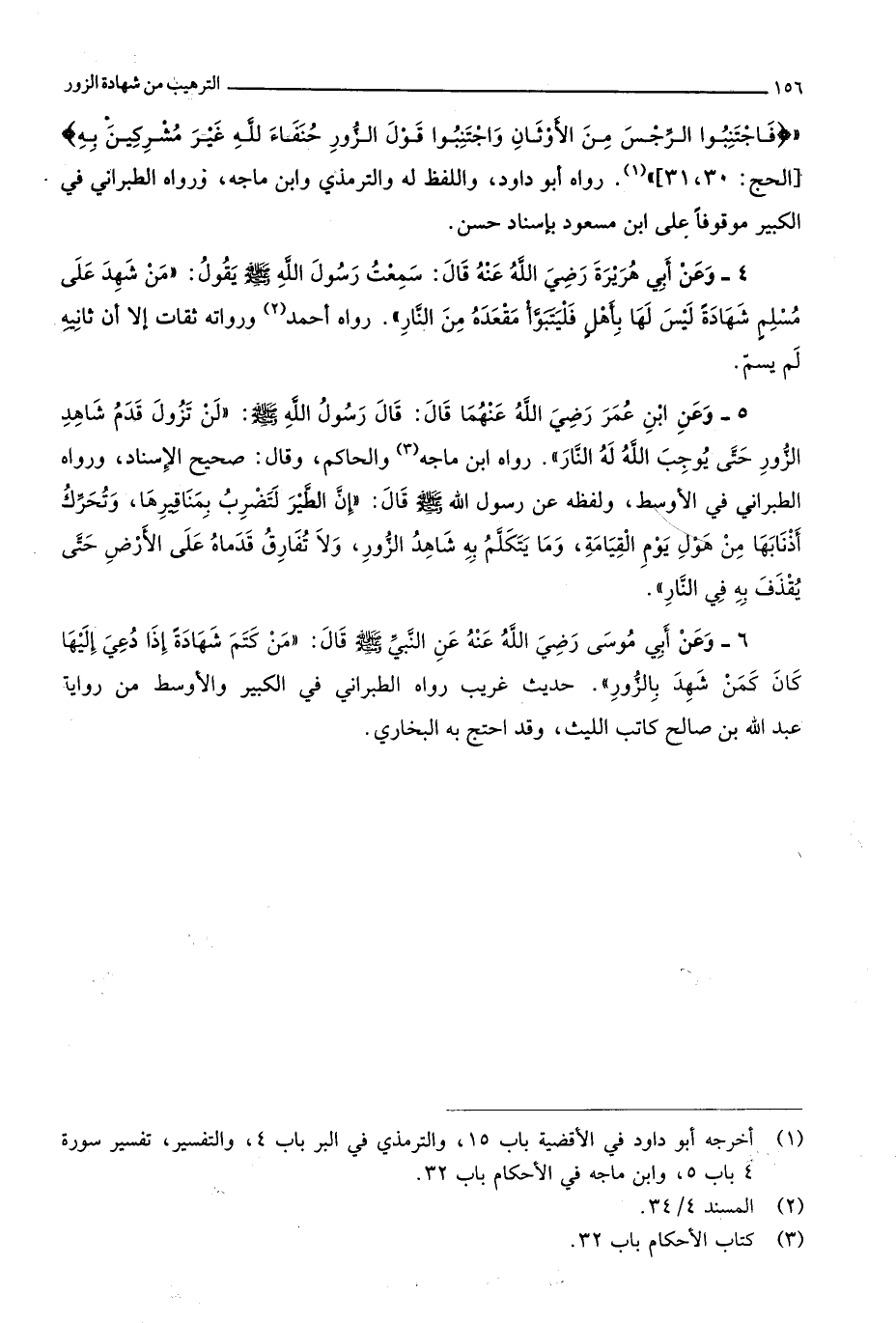رَوَاهُ ابْن مَاجَه وَالْحَاكِم وَقَالَ صَحِيح الْإِسْنَاد وَرَوَاهُ الطَّبَرَانِيّ فِي الْأَوْسَط وَلَفظه عَن رَسُول الله صلى الله عَلَيْهِ وَسلم قَالَ إِن الطير لتضرب بمناقيرها وتحرك أذنابها من هول يَوْم الْقِيَامَة وَمَا يتَكَلَّم بِهِ شَاهد الزُّور وَلَا تفارق قدماه على الأَرْض حَتَّى يقذف بِهِ فِي النَّار