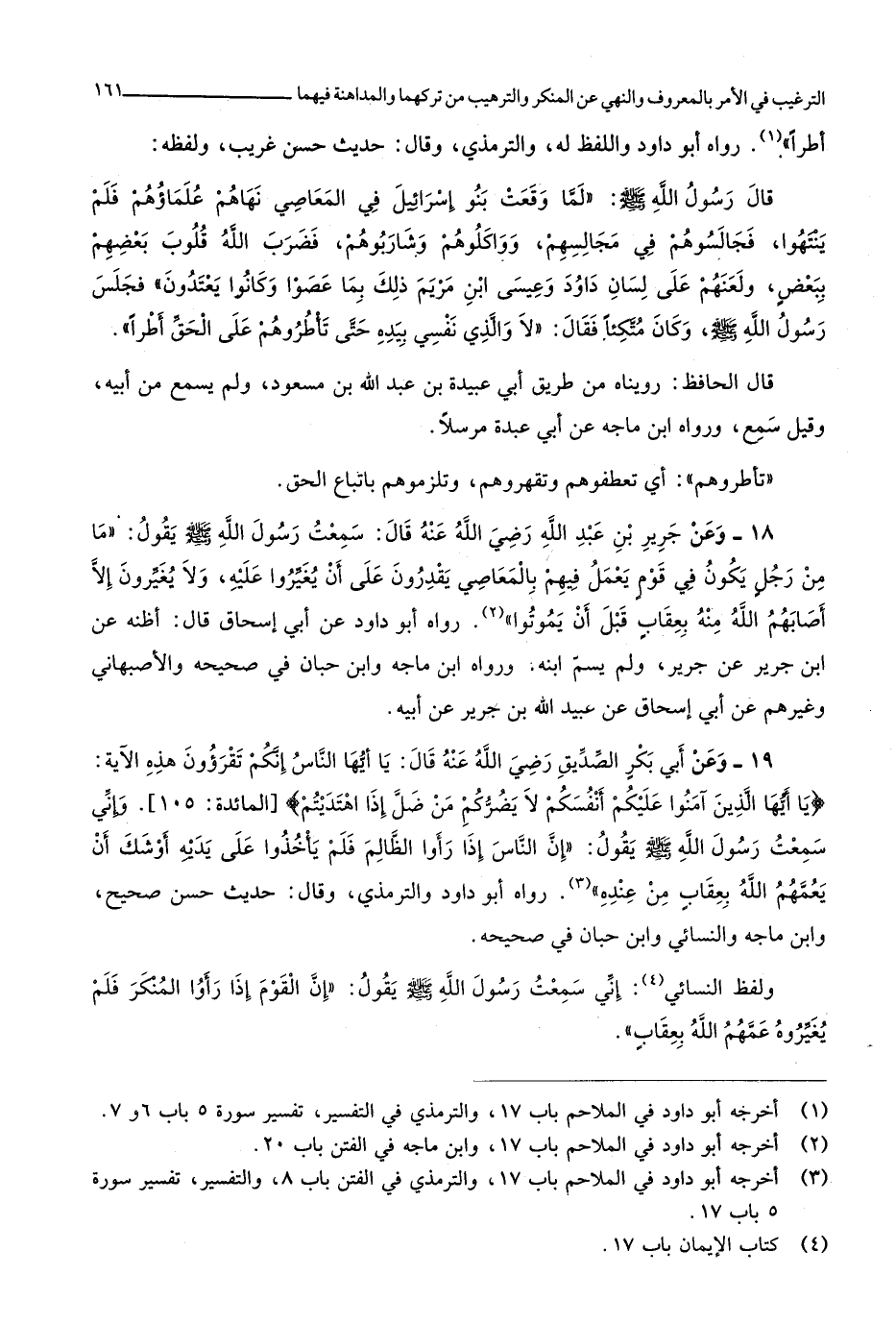 رَوَاهُ أَبُو دَاوُد وَاللَّفْظ لَهُ وَالتِّرْمِذِيّ وَقَالَ حَدِيث حسن غَرِيب وَلَفظه قَالَ رَسُول الله صلى الله عَلَيْهِ وَسلم لما وَقعت بَنو إِسْرَائِيل فِي الْمعاصِي نَهَاهُم علماؤهم فَلم ينْتَهوا فجالسوهم فِي مجَالِسهمْ وواكلوهم وشاربوهم فَضرب الله قُلُوب بَعضهم بِبَعْض ولعنهم على لِسَان دَاوُد وَعِيسَى ابْن مَرْيَم ذَلِك بِمَا عصوا وَكَانُوا يعتدون فَجَلَسَ رَسُول الله صلى الله عَلَيْهِ وَسلم وَكَانَ مُتكئا فَقَالَ لَا وَالَّذِي نَفسِي بِيَدِهِ حَتَّى تأطروهم على الْحق أطرا