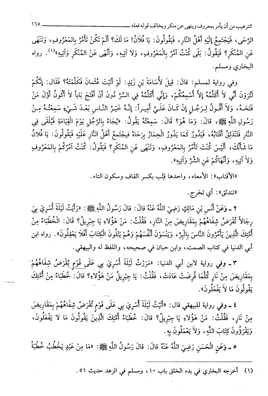 وَفِي رِوَايَة لمُسلم قَالَ قيل لأسامة بن زيد لَو أتيت عُثْمَان فكلمته فَقَالَ إِنَّكُم لترون أَنِّي لَا ُأكَلِّمهُ إِلَّا أسمعكم وَإِنِّي ُأكَلِّمهُ فِي السِّرّ دون أَن أفتح بَابا لَا أكون أول من فَتحه وَلَا أَقُول لرجل إِن كَانَ عَليّ أَمِيرا إِنَّه خير النَّاس بعد شَيْء سمعته من رَسُول الله صلى الله عَلَيْهِ وَسلم قَالَ وَمَا هُوَ قَالَ سمعته يَقُول يجاء بِالرجلِ يَوْم الْقِيَامَة فَيلقى فِي النَّار فتندلق أقتابه فيدور كَمَا يَدُور الْحمار برحاه فيجتمع أهل النَّار عَلَيْهِ فَيَقُولُونَ يَا فلَان مَا شَأْنك أَلَيْسَ كنت تَأمر بِالْمَعْرُوفِ وتنهى عَن الْمُنكر فَيَقُول كنت آمركُم بِالْمَعْرُوفِ وَلَا آتيه وأنهاكم عَن الشَّرّ وآتيه