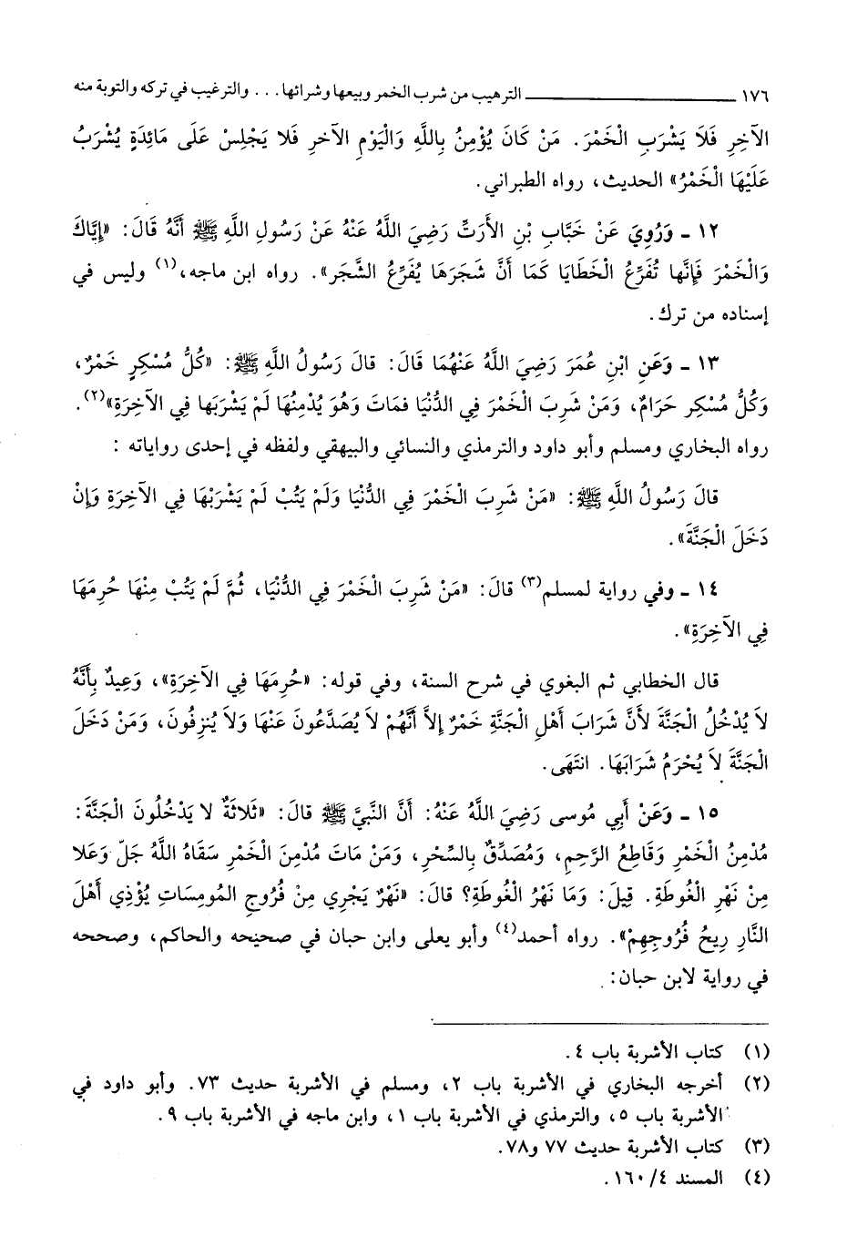 رَوَاهُ البُخَارِيّ وَمُسلم وَأَبُو دَاوُد وَالتِّرْمِذِيّ وَالنَّسَائِيّ وَالْبَيْهَقِيّ وَلَفظه فِي إِحْدَى رواياته قَالَ رَسُول الله صلى الله عَلَيْهِ وَسلم من شرب الْخمر فِي الدُّنْيَا وَلم يتب لم يشْربهَا فِي الْآخِرَة وَإِن دخل الْجنَّة