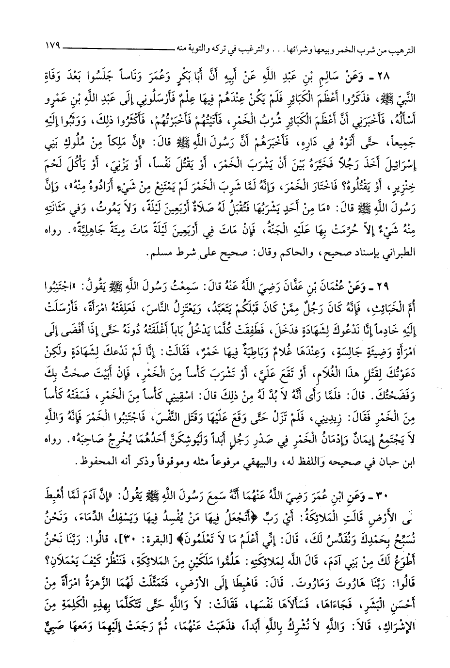 3573 - وَعَن سَالم بن عبد الله عَن أَبِيه أَن أَبَا بكر وَعمر وناسا جَلَسُوا بعد وَفَاة النَّبِي صلى الله عَلَيْهِ وَسلم فَذكرُوا أعظم الْكَبَائِر فَلم يكن عِنْدهم فِيهَا علم فأرسلوني إِلَى عبد الله بن عَمْرو أسأله فَأَخْبرنِي أَن أعظم الْكَبَائِر شرب الْخمر فأتيتهم فَأَخْبَرتهمْ فَأَكْثرُوا ذَلِك ووثبوا إِلَيْهِ جَمِيعًا حَتَّى أَتَوْهُ فِي دَاره فَأخْبرهُم أَن رَسُول الله صلى الله عَلَيْهِ وَسلم قَالَ إِن ملكا من مُلُوك بني إِسْرَائِيل أَخذ رجلا فخيره بَين أَن يشرب الْخمر أَو يقتل نفسا أَو يَزْنِي أَو يَأْكُل لحم خِنْزِير أَو يقتلوه فَاخْتَارَ الْخمر وَإنَّهُ لما شرب الْخمر لم يمْتَنع من شَيْء أرادوه مِنْهُ وَإِن رَسُول الله صلى الله عَلَيْهِ وَسلم قَالَ مَا من أحد يشْربهَا فَتقبل لَهُ صَلَاة أَرْبَعِينَ لَيْلَة وَلَا يَمُوت وَفِي مثانته مِنْهُ شَيْء إِلَّا حرمت بهَا عَلَيْهِ الْجنَّة فَإِن مَاتَ فِي أَرْبَعِينَ لَيْلَة مَاتَ ميتَة جَاهِلِيَّة