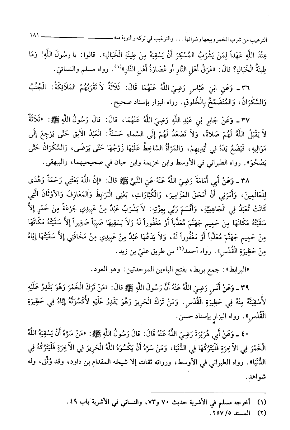 3583 - وَعَن أبي أُمَامَة رَضِي الله عَنهُ عَن النَّبِي صلى الله عَلَيْهِ وَسلم قَالَ إِن الله بَعَثَنِي رَحْمَة وَهدى للْعَالمين وَأَمرَنِي أَن أمحق المزامير والكبارات يَعْنِي البرابط وَالْمَعَازِف والأوثان الَّتِي كَانَت تعبد فِي الْجَاهِلِيَّة وَأقسم رَبِّي بعزته لَا يشرب عبد من عَبِيدِي جرعة من خمر إِلَّا سقيته مَكَانهَا من حميم جَهَنَّم معذبا أَو مغفورا لَهُ وَلَا يسقيها صَبيا صَغِيرا إِلَّا سقيته مَكَانهَا من حميم جَهَنَّم معذبا أَو مغفورا لَهُ وَلَا يَدعهَا عبد من عَبِيدِي من مخافتي إِلَّا سقيتها إِيَّاه من حَظِيرَة الْقُدس