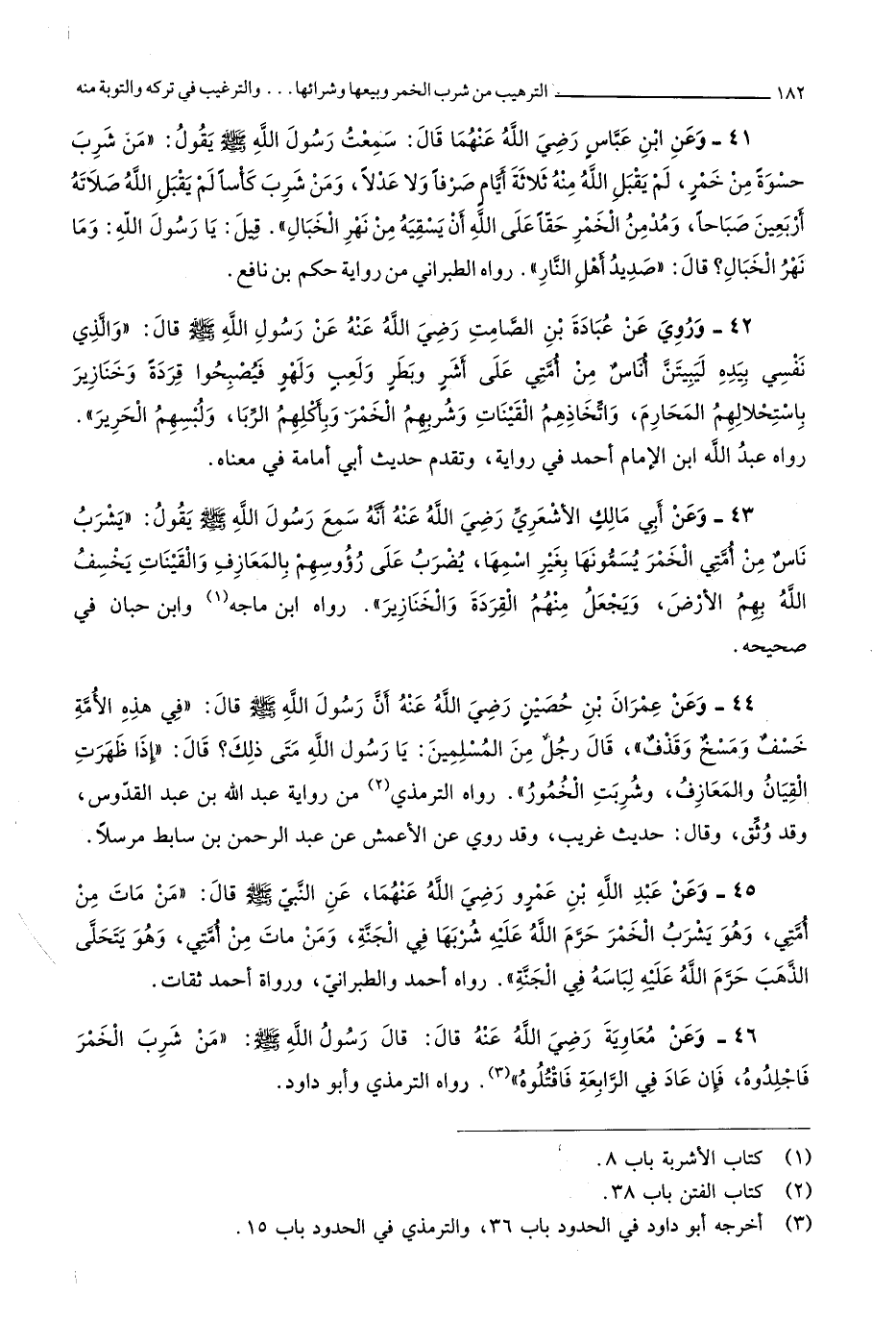 3586 - وَعَن ابْن عَبَّاس رَضِي الله عَنْهُمَا قَالَ سَمِعت رَسُول الله صلى الله عَلَيْهِ وَسلم يَقُول من شرب حسوة من خمر لم يقبل الله مِنْهُ ثَلَاثَة أَيَّام صرفا وَلَا عدلا وَمن شرب كأسا لم يقبل الله صلَاته أَرْبَعِينَ صباحا ومدمن الْخمر حَقًا على الله أَن يسْقِيه من نهر الخبال