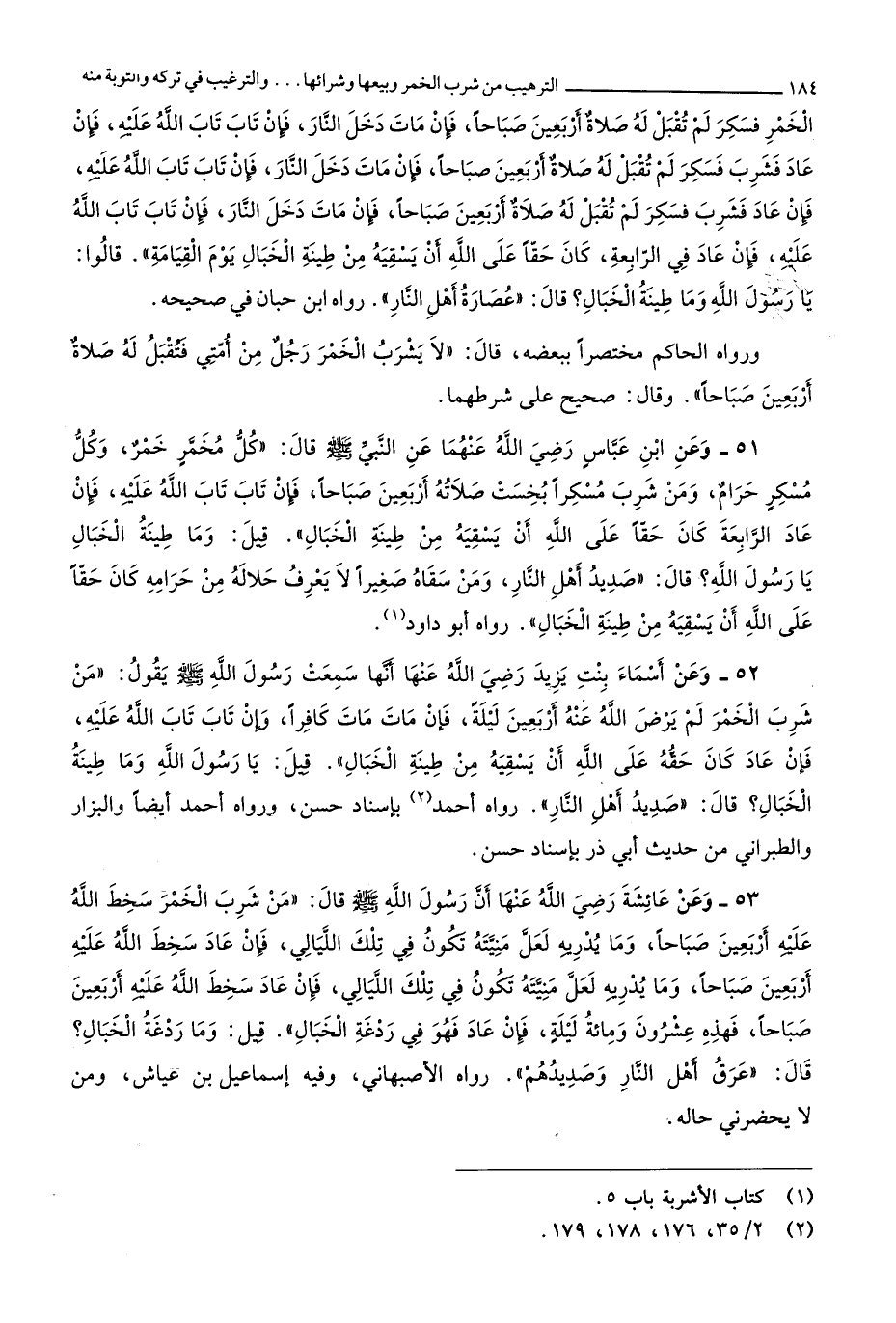 الْخمر فَسَكِرَ لم تقبل لَهُ صَلَاة أَرْبَعِينَ صباحا فَإِن مَاتَ دخل النَّار فَإِن تَابَ تَابَ الله عَلَيْهِ فَإِن عَاد فَشرب فَسَكِرَ لم تقبل لَهُ صَلَاة أَرْبَعِينَ صباحا فَإِن مَاتَ دخل النَّار فَإِن تَابَ تَابَ الله عَلَيْهِ فَإِن عَاد فَشرب فَسَكِرَ لم تقبل لَهُ صَلَاة أَرْبَعِينَ صباحا فَإِن مَاتَ دخل النَّار فَإِن تَابَ تَابَ الله عَلَيْهِ فَإِن عَاد فِي الرَّابِعَة كَانَ حَقًا على الله أَن يسْقِيه من طِينَة الخبال يَوْم الْقِيَامَة