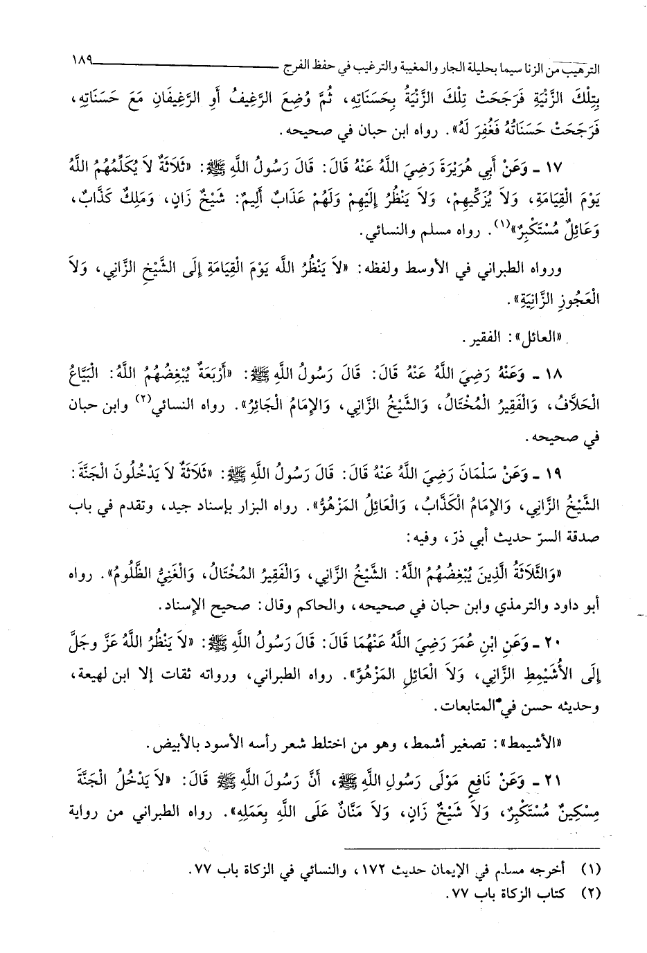 رَوَاهُ الْبَزَّار بِإِسْنَاد جيد وَتقدم فِي بَاب صَدَقَة السِّرّ حَدِيث أبي ذَر وَفِيه وَالثَّلَاثَة الَّذين يبغضهم الله الشَّيْخ الزَّانِي وَالْفَقِير المختال والغني الظلوم