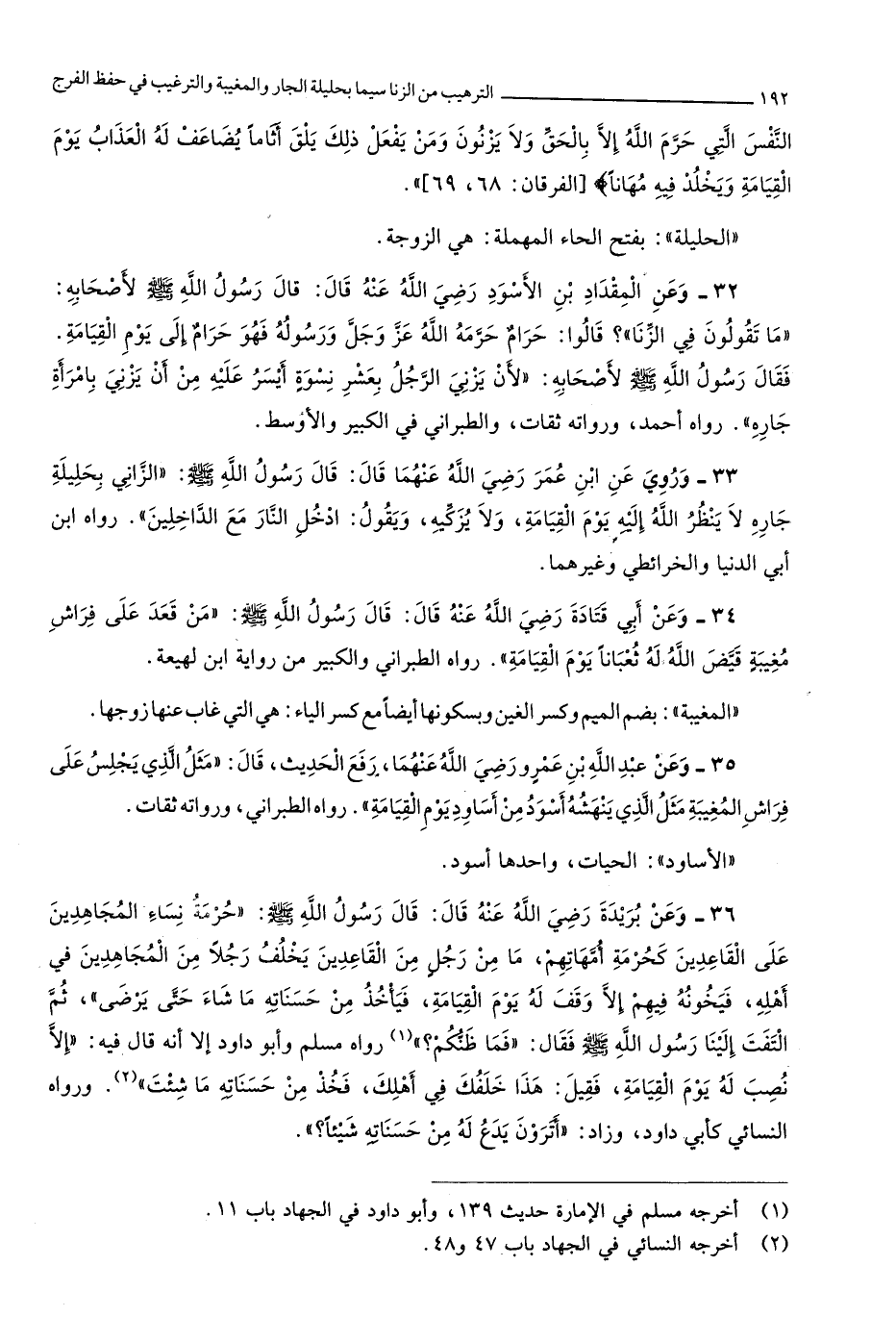 3636 - وَعَن عبد الله بن عَمْرو رَضِي الله عَنْهُمَا رفع الحَدِيث قَالَ مثل الَّذِي يجلس على فرَاش المغيبة مثل الَّذِي ينهشه أسود من أساود يَوْم الْقِيَامَة