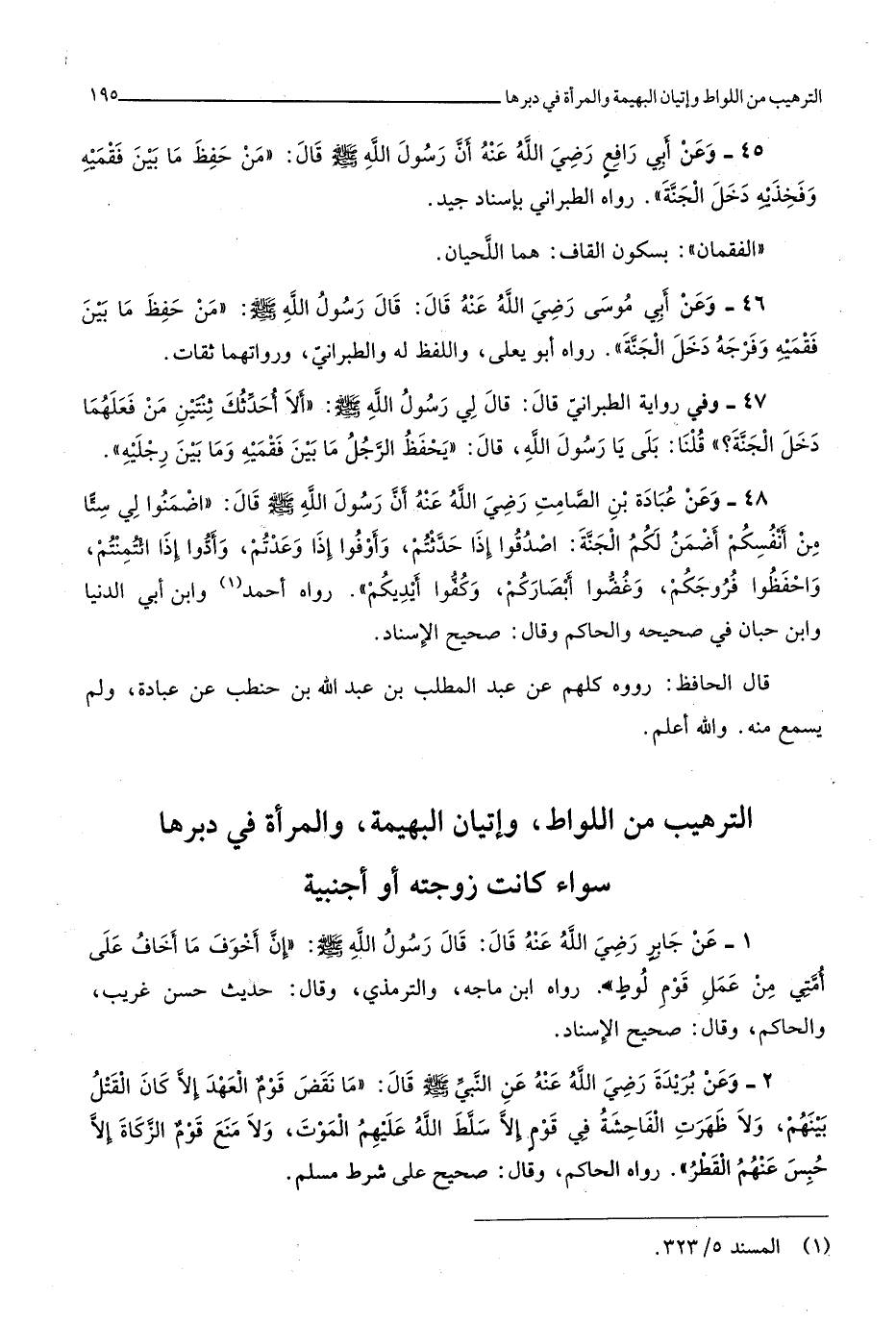 رح 74 وَفِي رِوَايَة الطَّبَرَانِيّ قَالَ قَالَ لي رَسُول الله صلى الله عَلَيْهِ وَسلم أَلا أحَدثك ثِنْتَيْنِ من فعلهمَا دخل الْجنَّة قُلْنَا بلَى يَا رَسُول الله قَالَ يحفظ الرجل مَا بَين فقميه وَمَا بَين رجلَيْهِ