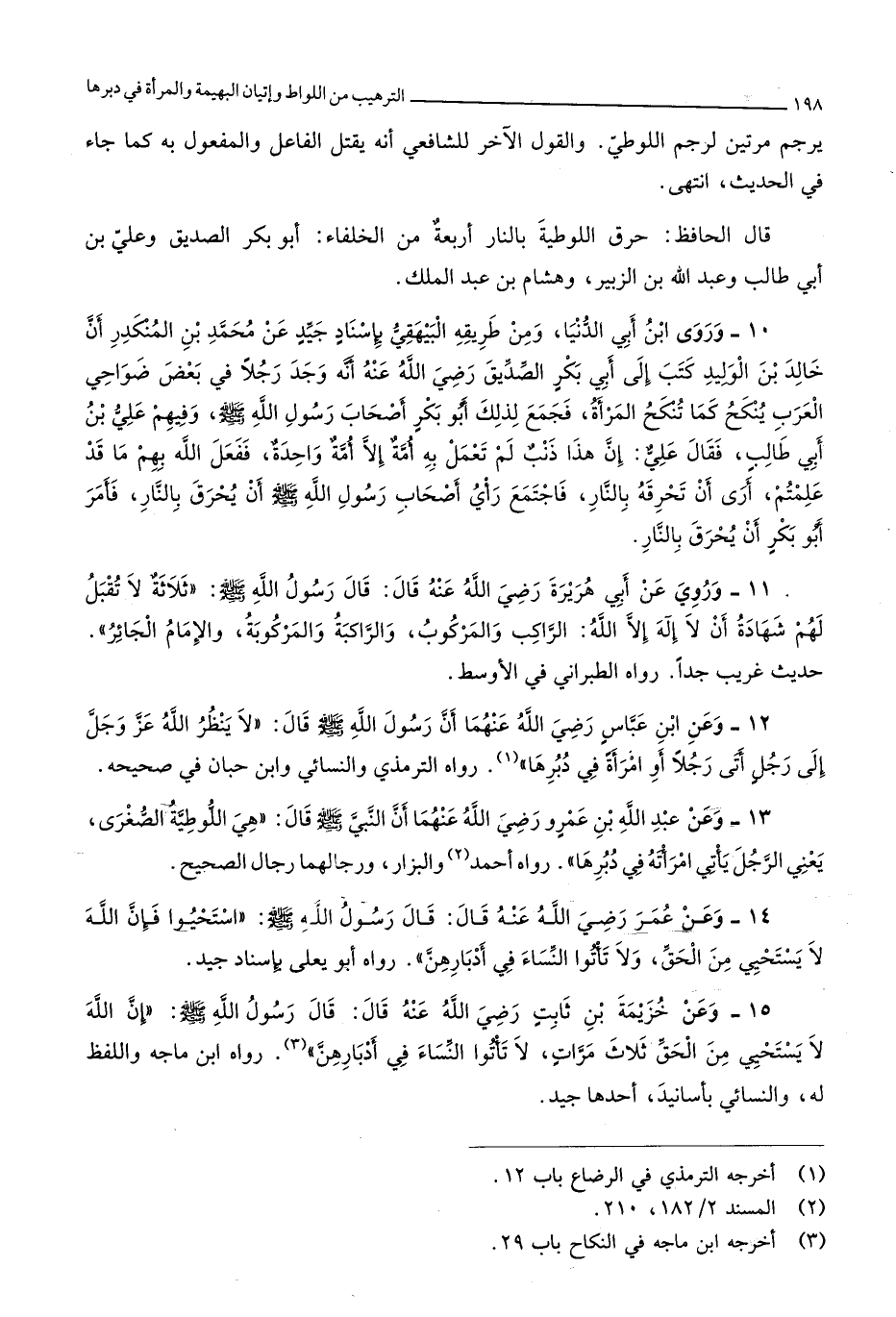 3658181 - 8 1 وروى ابْن أبي الدُّنْيَا وَمن طَرِيقه الْبَيْهَقِيّ بِإِسْنَاد جيد عَن مُحَمَّد بن الْمُنْكَدر أَن خَالِد بن الْوَلِيد كتب إِلَى أبي بكر الصّديق رَضِي الله عَنهُ أَنه وجد رجلا فِي بعض ضواحي الْعَرَب ينْكح كَمَا تنْكح الْمَرْأَة فَجمع لذَلِك أَبُو بكر أَصْحَاب رَسُول الله صلى الله عَلَيْهِ وَسلم وَفِيهِمْ عَليّ بن أبي طَالب فَقَالَ عَليّ إِن هَذَا ذَنْب لم تعْمل بِهِ أمة إِلَّا أمة وَاحِدَة فَفعل الله بهم مَا قد علمْتُم أرى أَن تحرقه بالنَّار فَاجْتمع رَأْي أَصْحَاب رَسُول الله صلى الله عَلَيْهِ وَسلم أَن يحرق بالنَّار فَأمر أَبُو بكر أَن يحرق بالنَّار