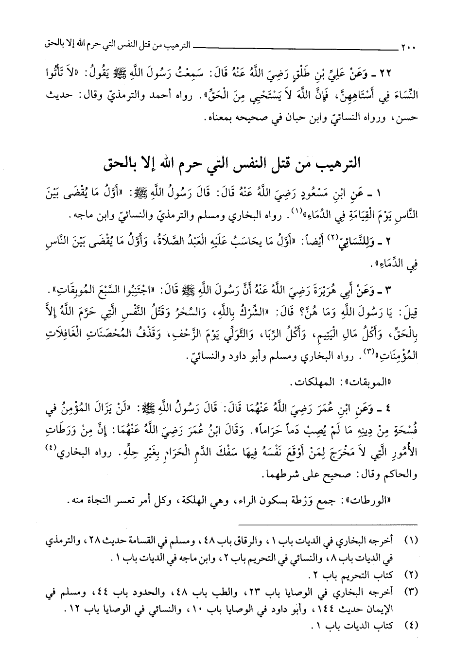 وَقَالَ ابْن عمر رَضِي الله عَنْهُمَا إِن من ورطات الْأُمُور الَّتِي لَا مخرج لمن أوقع نَفسه فِيهَا سفك الدَّم الْحَرَام بِغَيْر حلّه