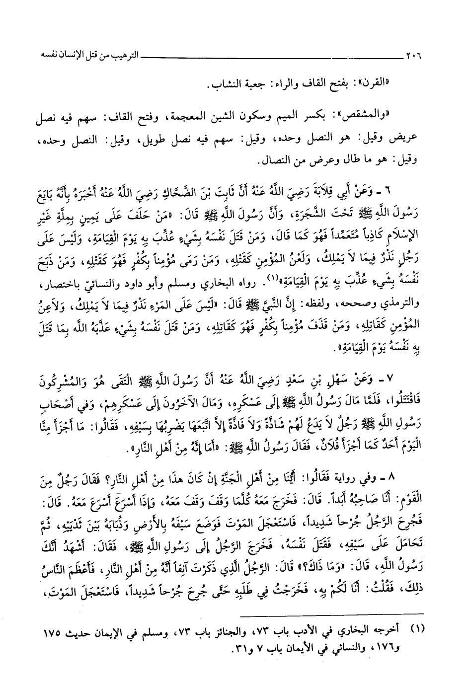 رَوَاهُ البُخَارِيّ وَمُسلم وَأَبُو دَاوُد وَالنَّسَائِيّ بِاخْتِصَار وَالتِّرْمِذِيّ وَصَححهُ وَلَفظه إِن النَّبِي صلى الله عَلَيْهِ وَسلم قَالَ لَيْسَ على الْمَرْء نذر فِيمَا لَا يملك ولاعن الْمُؤمن كقاتله وَمن قذف مُؤمنا بِكفْر فَهُوَ كقاتله وَمن قتل نَفسه بِشَيْء عذبه الله بِمَا قتل بِهِ نَفسه يَوْم الْقِيَامَة