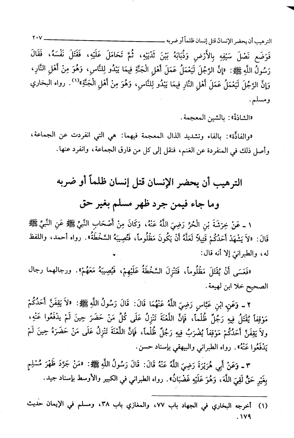 التَّرْهِيب أَن يحضر الْإِنْسَان قتل إِنْسَان ظلما أَو ضربه وَمَا جَاءَ فِيمَن جرد ظهر مُسلم بِغَيْر حق 1 عَن خَرشَة بن الْحر رَضِي الله عَنهُ وَكَانَ من أَصْحَاب النَّبِي صلى الله عَلَيْهِ وَسلم عَن النَّبِي صلى الله عَلَيْهِ وَسلم قَالَ لَا يشْهد أحدكُم قَتِيلا لَعَلَّه أَن يكون مَظْلُوما فتصيبه السخطة