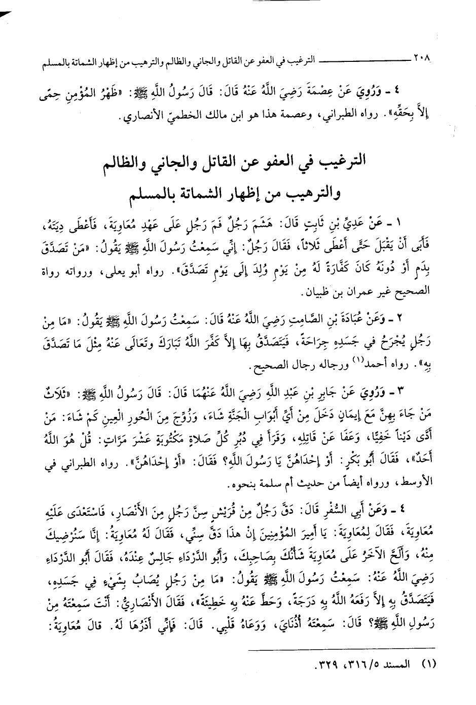 3711 - وَعَن أبي السّفر قَالَ دق رجل من قُرَيْش سنّ رجل من الْأَنْصَار فاستعدى عَلَيْهِ مُعَاوِيَة فَقَالَ لمعاوية يَا أَمِير الْمُؤمنِينَ إِن هَذَا دق سني فَقَالَ لَهُ مُعَاوِيَة إِنَّا سنرضيك مِنْهُ وألح الآخر على مُعَاوِيَة شَأْنك بصاحبك وَأَبُو الدَّرْدَاء جَالس عِنْده فَقَالَ أَبُو الدَّرْدَاء رَضِي الله عَنهُ سَمِعت رَسُول الله صلى الله عَلَيْهِ وَسلم يَقُول مَا من رجل يصاب بِشَيْء فِي جسده فَيتَصَدَّق بِهِ إِلَّا رَفعه الله بِهِ دَرَجَة وَحط عَنهُ بِهِ خَطِيئَة فَقَالَ الْأنْصَارِيّ أَنْت سمعته من رَسُول الله صلى الله عَلَيْهِ وَسلم قَالَ سمعته أذناي ووعاه قلبِي