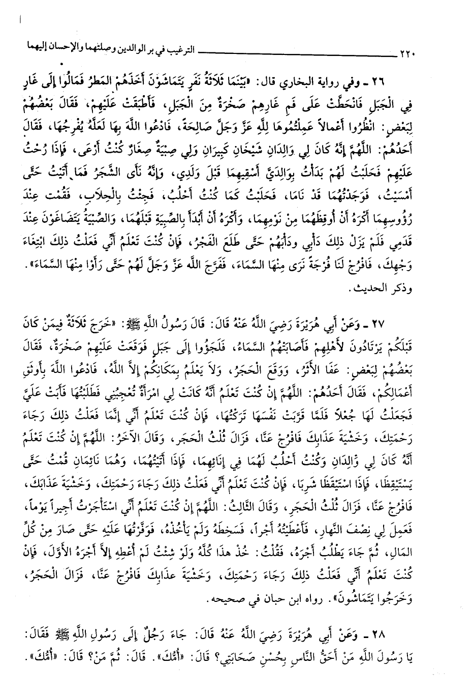 3764 - وَفِي رِوَايَة البُخَارِيّ قَالَ بَيْنَمَا ثَلَاثَة نفر يتماشون أَخذهم الْمَطَر فمالوا إِلَى غَار فِي الْجَبَل فانحطت على غارهم صَخْرَة من الْجَبَل فأطبقت عَلَيْهِم فَقَالَ بَعضهم لبَعض انْظُرُوا أعمالا عملتموها لله عز وَجل صَالِحَة فَادعوا الله بهَا لَعَلَّه يفرجها فَقَالَ أحدهم اللَّهُمَّ إِنَّه كَانَ لي والدان شَيْخَانِ كبيران ولي صبية صغَار كنت أرعى فَإِذا رحت عَلَيْهِم فحلبت لَهُم بدأت بوالدي أسقيهما قبل وَلَدي وَإنَّهُ نأى الشّجر فَمَا أتيت حَتَّى أمسيت فوجدتهما قد نَامَا فحلبت كَمَا كنت أحلب فَجئْت بالحلاب فَقُمْت عِنْد رؤوسهما أكره أَن أوقظهما من نومهما وأكره أَن أبدأ بالصبية قبلهمَا والصبية يتضاغون عِنْد قدمي فَلم يزل ذَلِك دأبي ودأبهم حَتَّى طلع الْفجْر فَإِن كنت تعلم أَنِّي فعلت ذَلِك ابْتِغَاء وَجهك فافرج لنا فُرْجَة نرى مِنْهَا السَّمَاء فَفرج الله عز وَجل لَهُم حَتَّى رَأَوْا مِنْهَا السَّمَاء