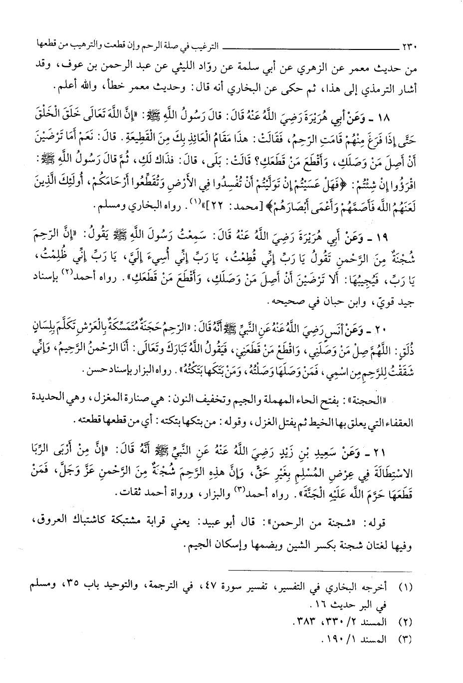 3810 - وَعَن سعيد بن زيد رَضِي الله عَنهُ عَن النَّبِي صلى الله عَلَيْهِ وَسلم أَنه قَالَ إِن من أربى الرِّبَا الاستطالة فِي عرض الْمُسلم بِغَيْر حق وَإِن هَذِه الرَّحِم شجنة من الرَّحْمَن عز وَجل فَمن قطعهَا حرم الله عَلَيْهِ الْجنَّة