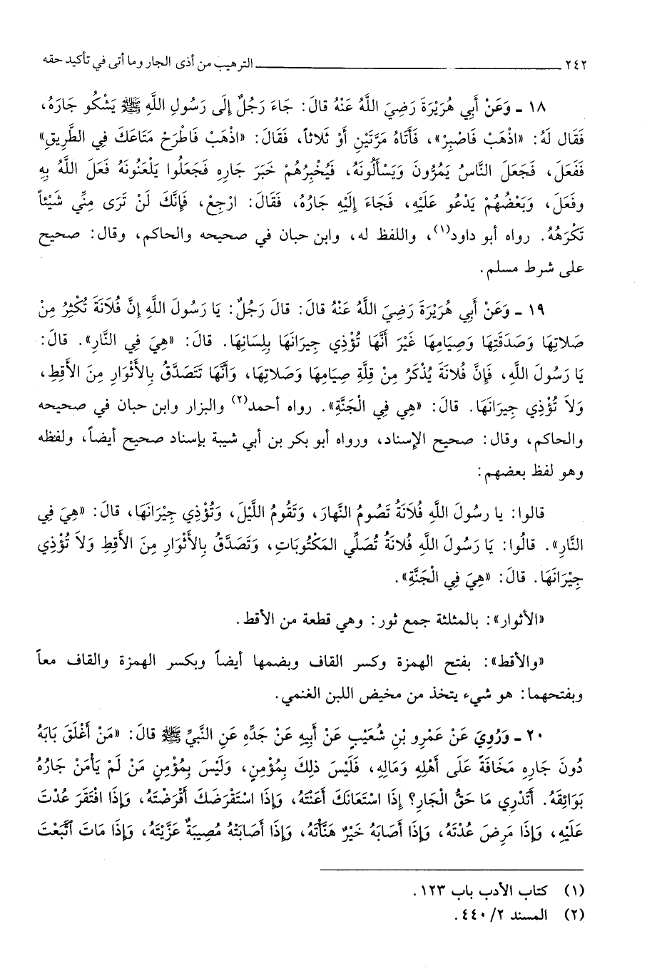 قَالَ يَا رَسُول الله فَإِن فُلَانَة يذكر من قلَّة صيامها وصلاتها وَأَنَّهَا تَتَصَدَّق بالأثوار من الأقط وَلَا تؤذي جِيرَانهَا