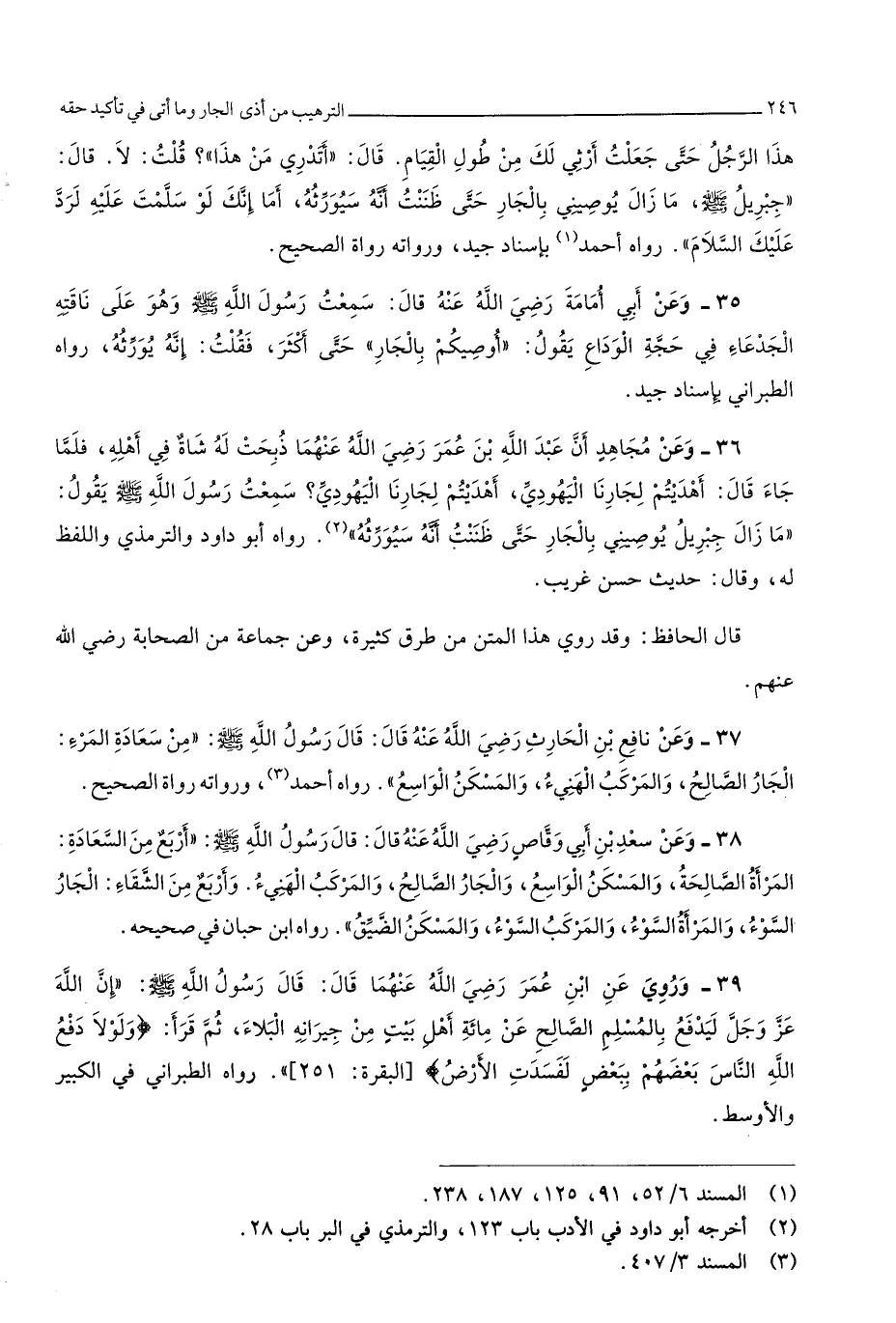 3885 - وَعَن أبي أُمَامَة رَضِي الله عَنهُ قَالَ سَمِعت رَسُول الله صلى الله عَلَيْهِ وَسلم وَهُوَ على نَاقَته الجدعاء فِي حجَّة الْوَدَاع يَقُول أوصيكم بالجار حَتَّى أَكثر فَقلت إِنَّه يورثه رَوَاهُ الطَّبَرَانِيّ بِإِسْنَاد جيد