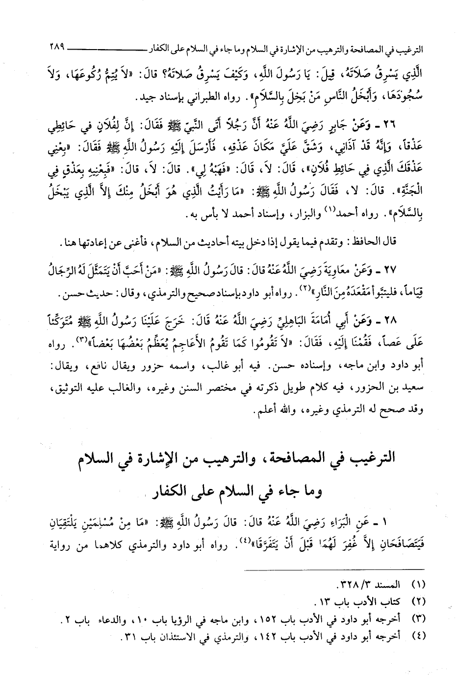 التَّرْغِيب فِي المصافحة والترهيب من الْإِشَارَة فِي السَّلَام وَمَا جَاءَ فِي السَّلَام على الْكفَّار