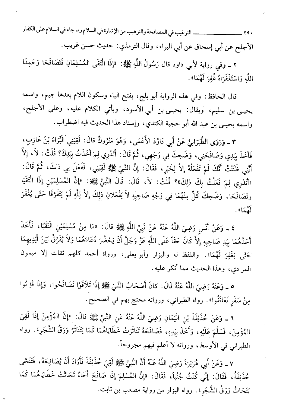 4112 - وروى الطَّبَرَانِيّ عَن أبي دَاوُد الْأَعْمَى وَهُوَ مَتْرُوك قَالَ لَقِيَنِي الْبَراء بن عَازِب فَأخذ بيَدي وصافحني وَضحك فِي وَجْهي ثمَّ قَالَ أَتَدْرِي لم أخذت بِيَدِك قلت لَا إِلَّا أنني ظَنَنْت أَنَّك لم تَفْعَلهُ إِلَّا لخير فَقَالَ إِن النَّبِي صلى الله عَلَيْهِ وَسلم لَقِيَنِي فَفعل بِي ذَلِك ثمَّ قَالَ أَتَدْرِي لم فعلت بك ذَلِك قلت لَا قَالَ قَالَ النَّبِي صلى الله عَلَيْهِ وَسلم إِن الْمُسلمين إِذا التقيا وتصافحا وَضحك كل مِنْهُمَا فِي وَجه صَاحبه لَا يفْعَلَانِ ذَلِك إِلَّا لله لم يَتَفَرَّقَا حَتَّى يغْفر لَهما